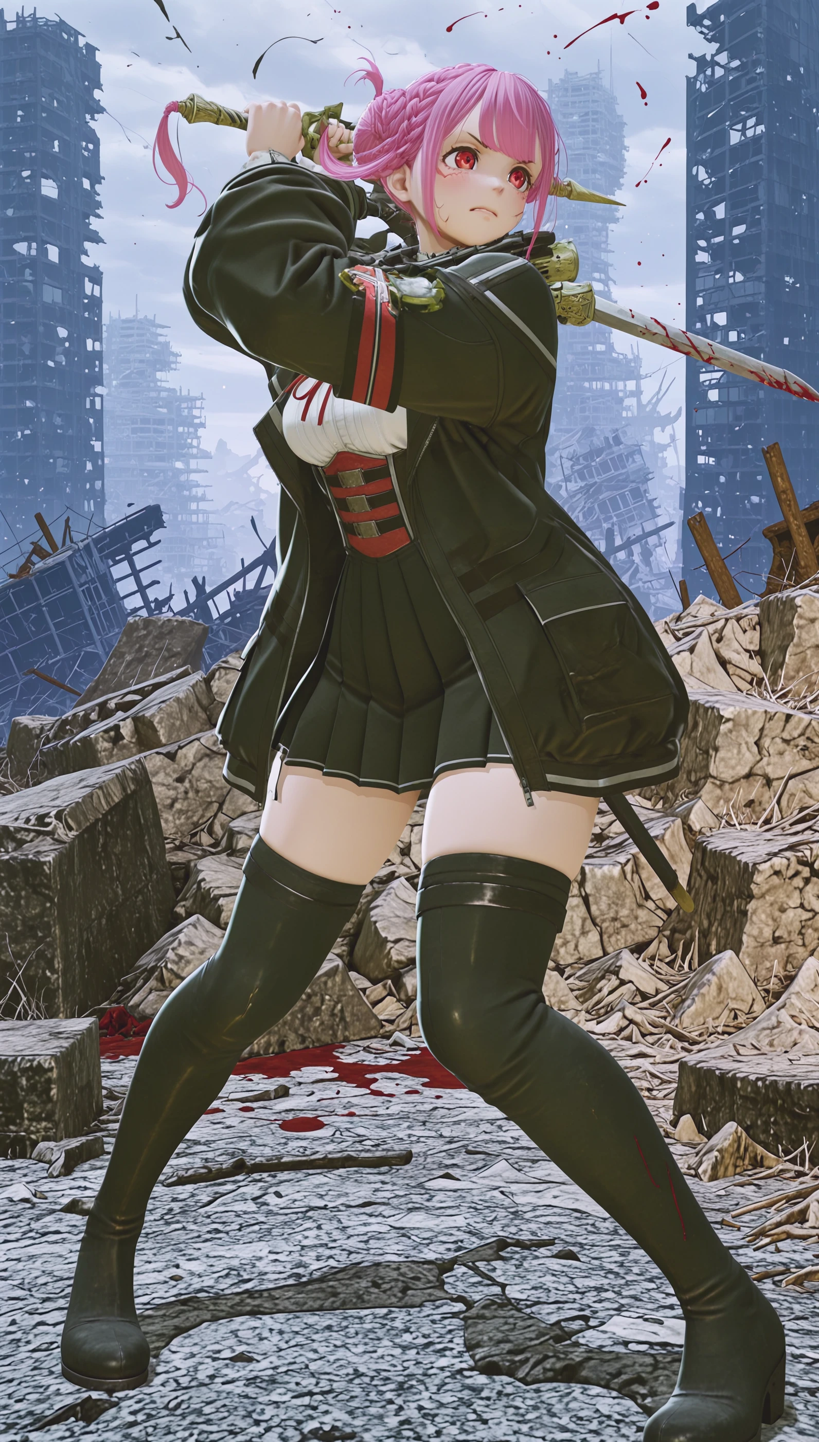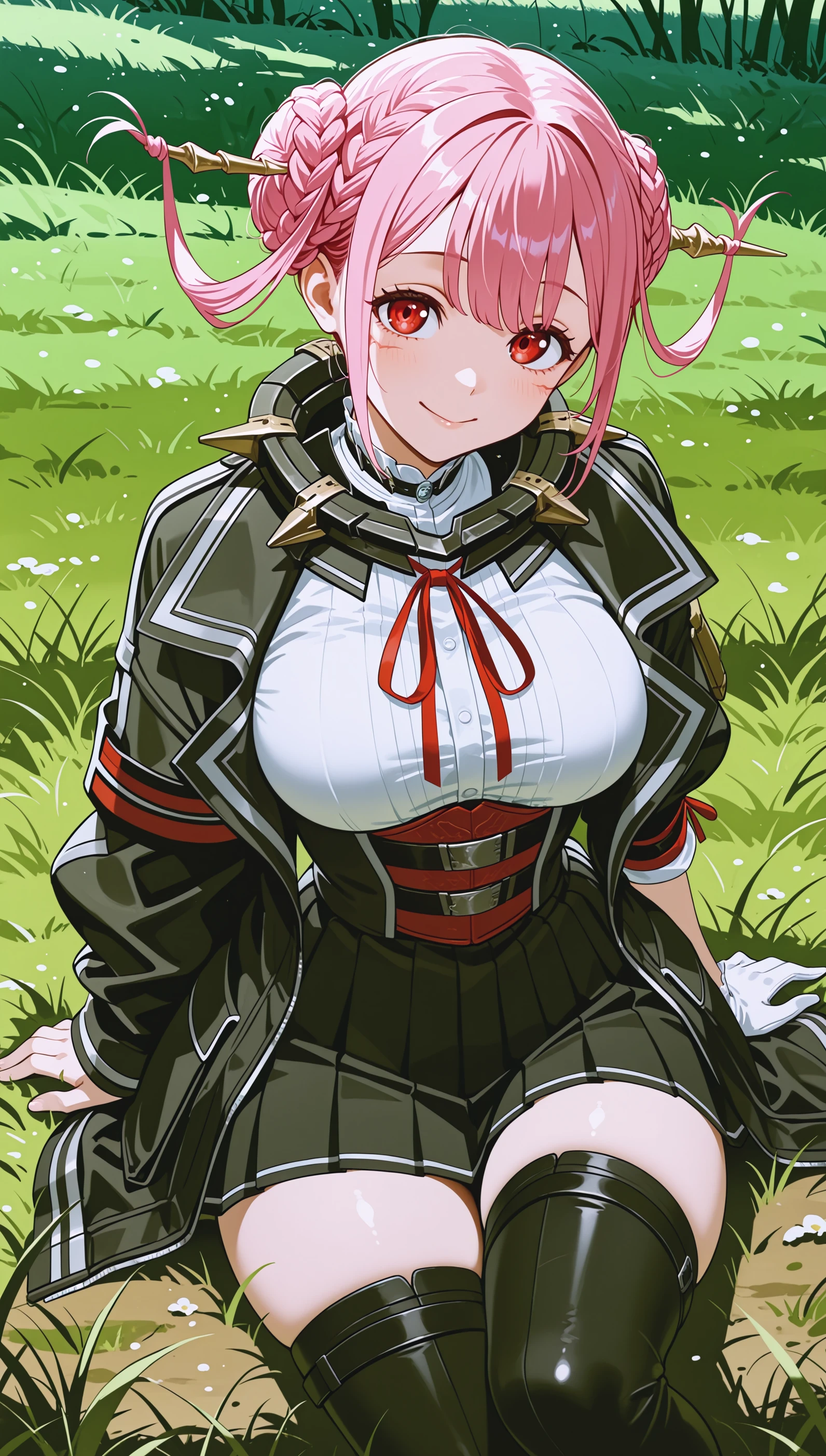 Iris: thighhighs, thigh boots, skirt, white shirt, black jacket