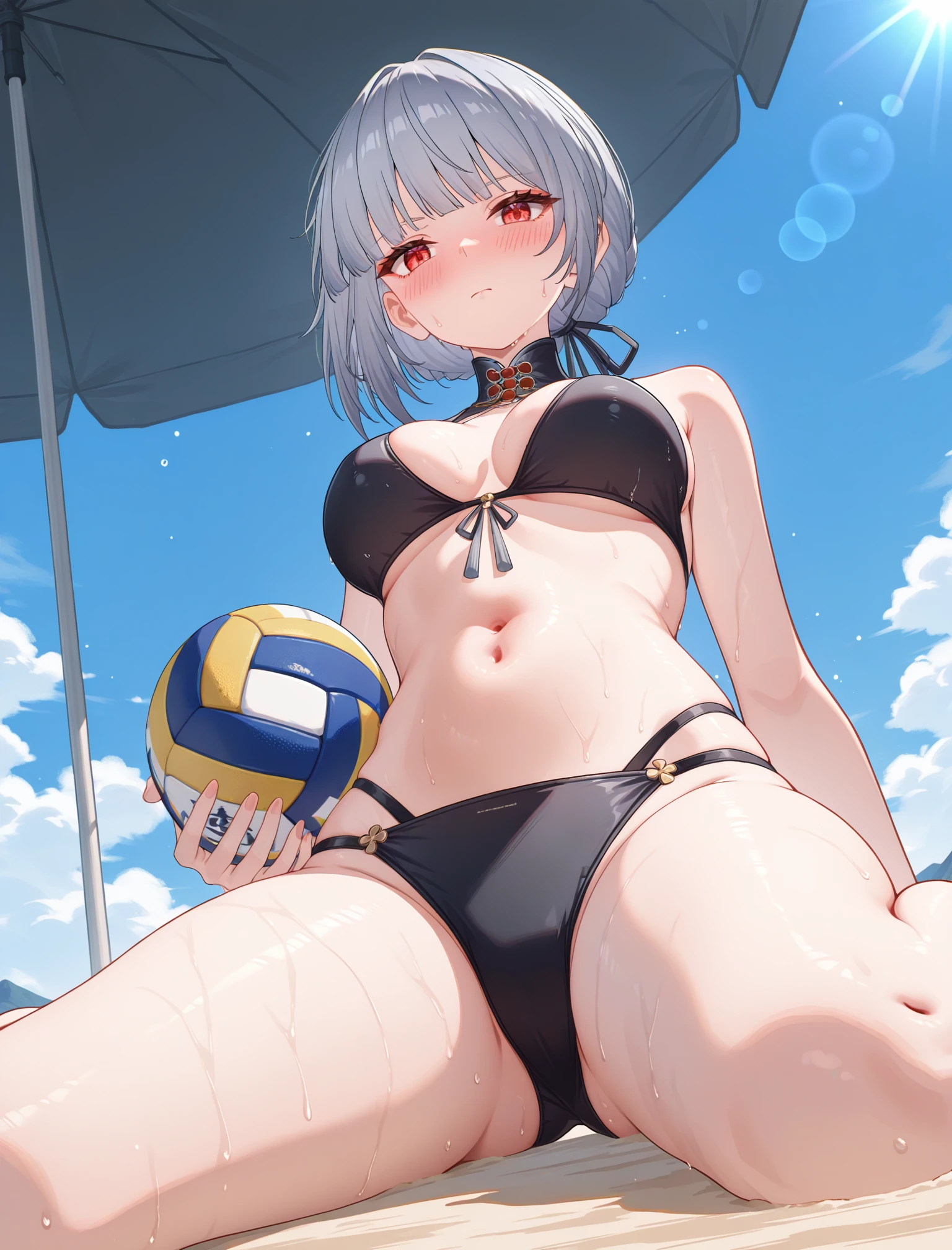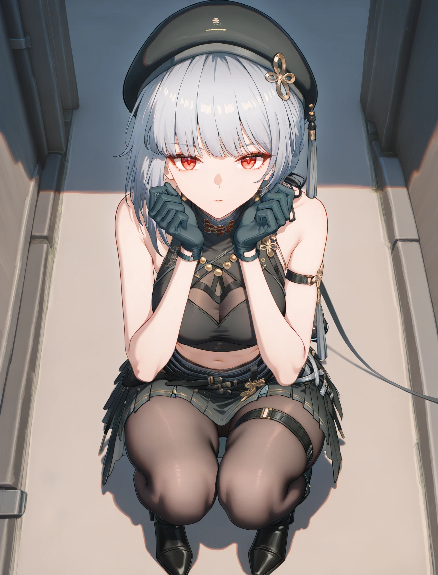 Sanhua, red eyes, grey hair, short hair, beret, sleeveless shirt, crop top, gloves, skirt, pantyhose, thigh strap, high heel boots, masterpiece, best quality, amazing quality, very aesthetic, high resolution, ultra-detailedNegative prompts