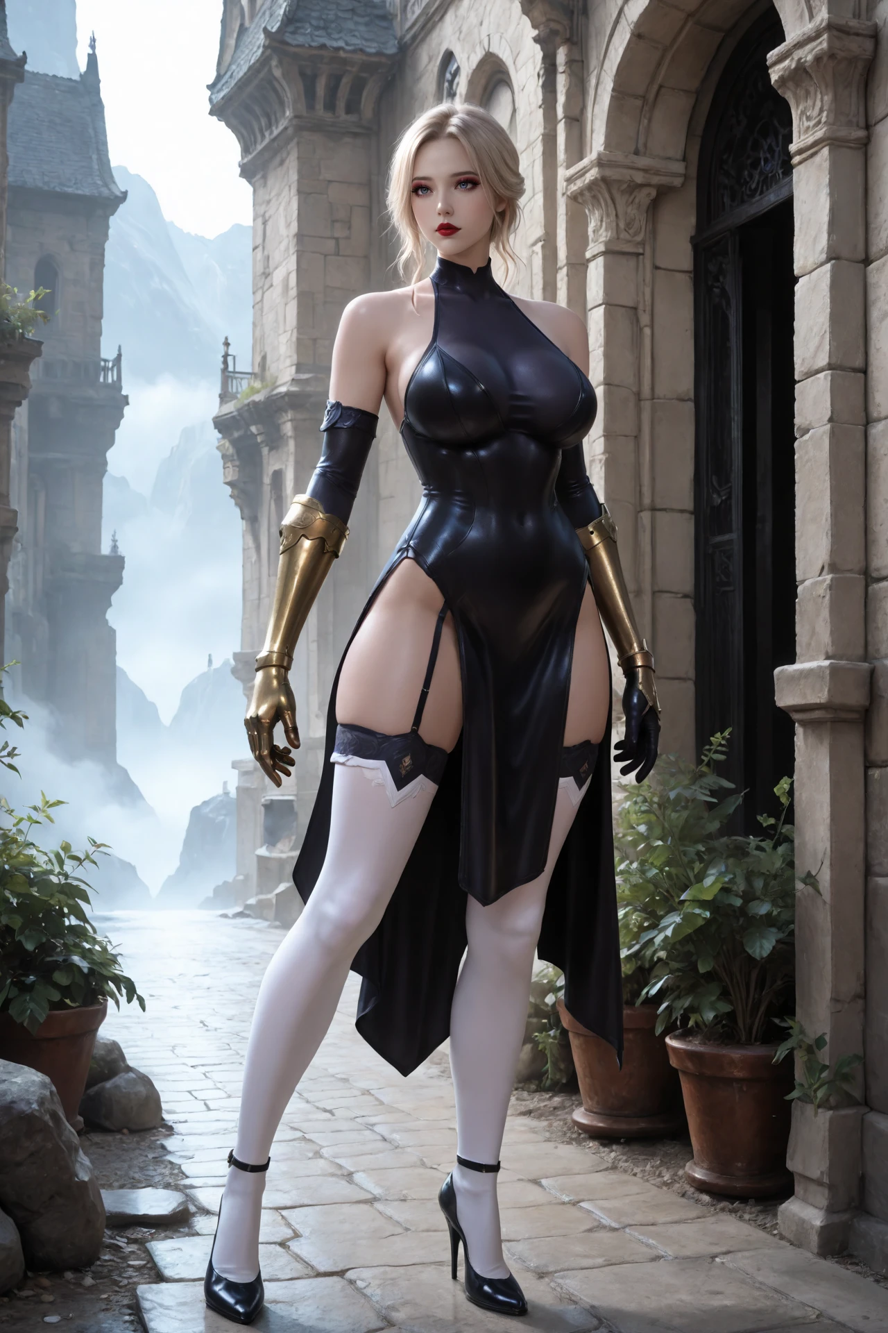 halter dress,elbow_gloves,single_gauntlet,short pelvic_curtain,thighhighs,high_heels, large_breasts,bare_shoulders,covered_collarbone
