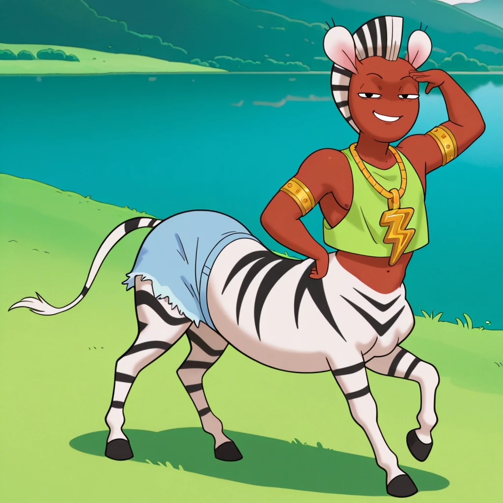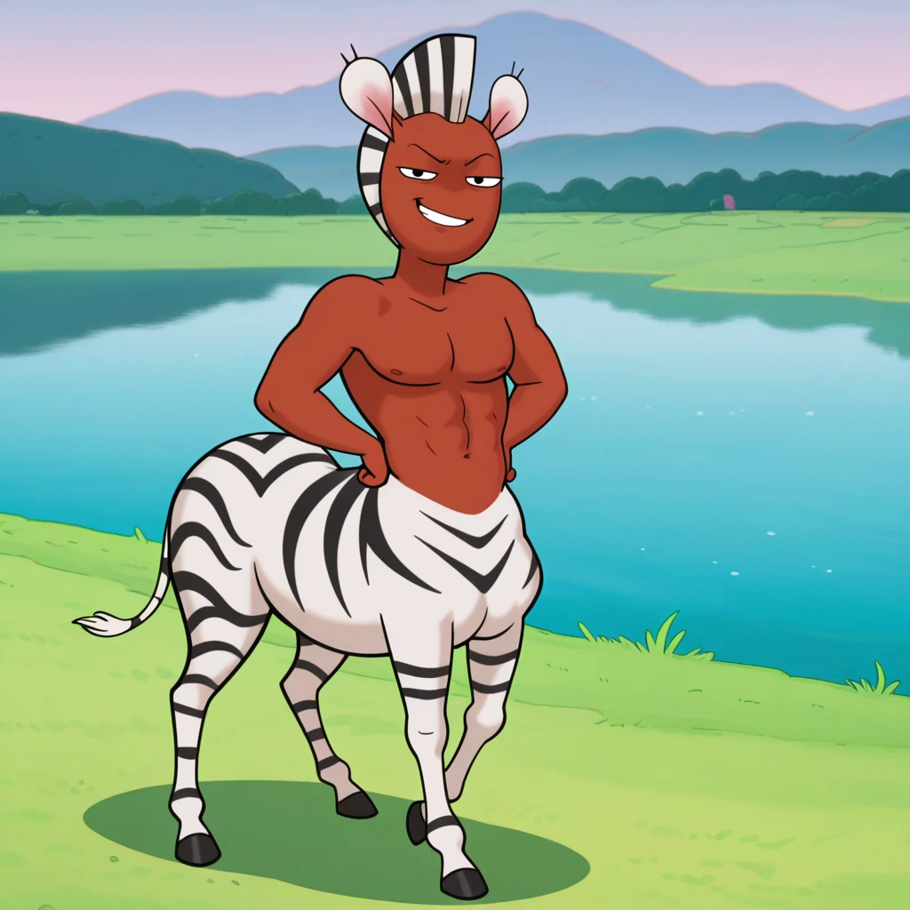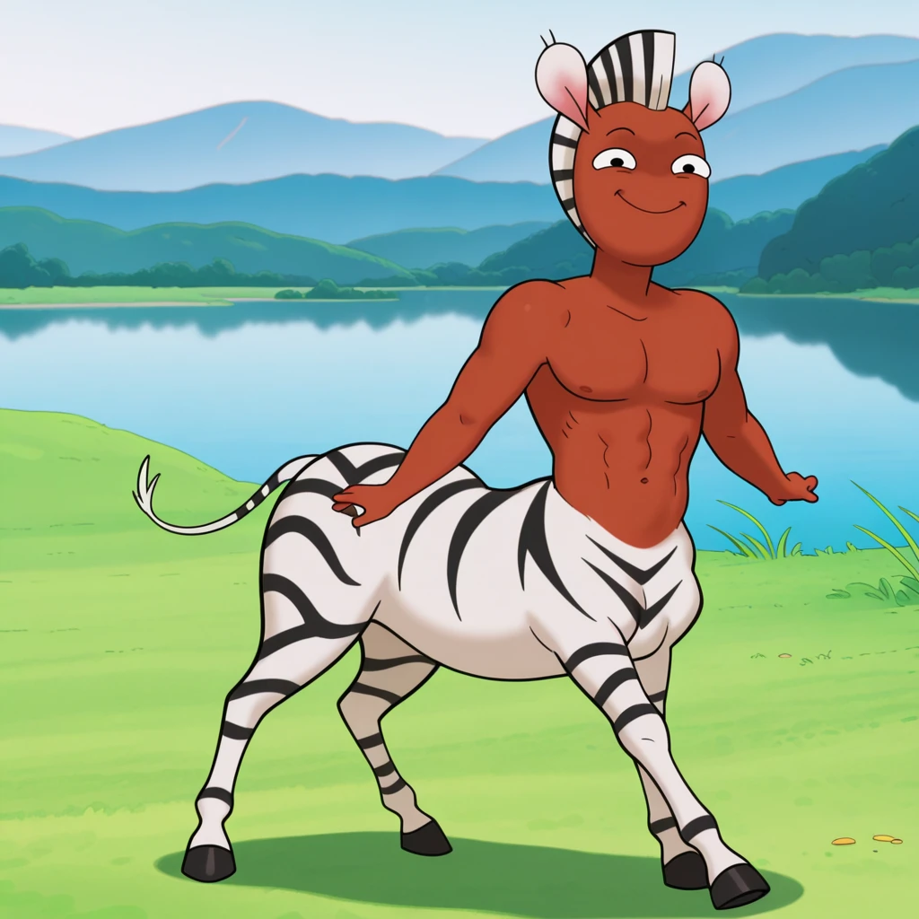 male, furry male, centaur, humanoid, zebra, solo, dark skin, white fur, striped fur, short hair, striped mohawk, black eyes, no nose, short ears, tail, tail tuft, black hooves, muscular