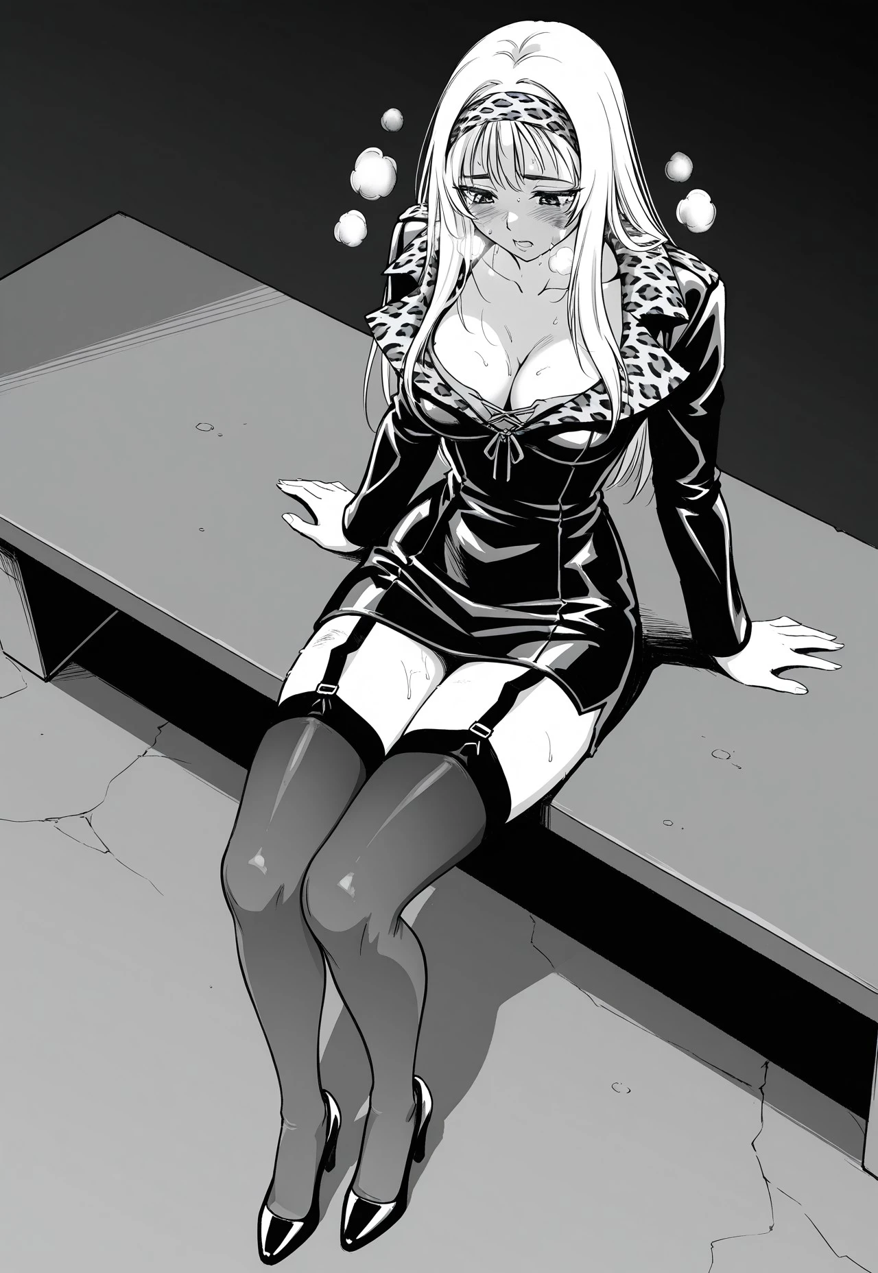 black leather half coat, deep plunging neckline, leopard-print lapel collar, fur collar, wide folded collar, panelled waist seams, long fitted sleeves, lace-up inner top, crisscross front lacing, exposed cleavage, fitted inner bodice, garter belt straps, metal garter buckles, black thighhighs, sheer thighhighs, black trim, black high heels,