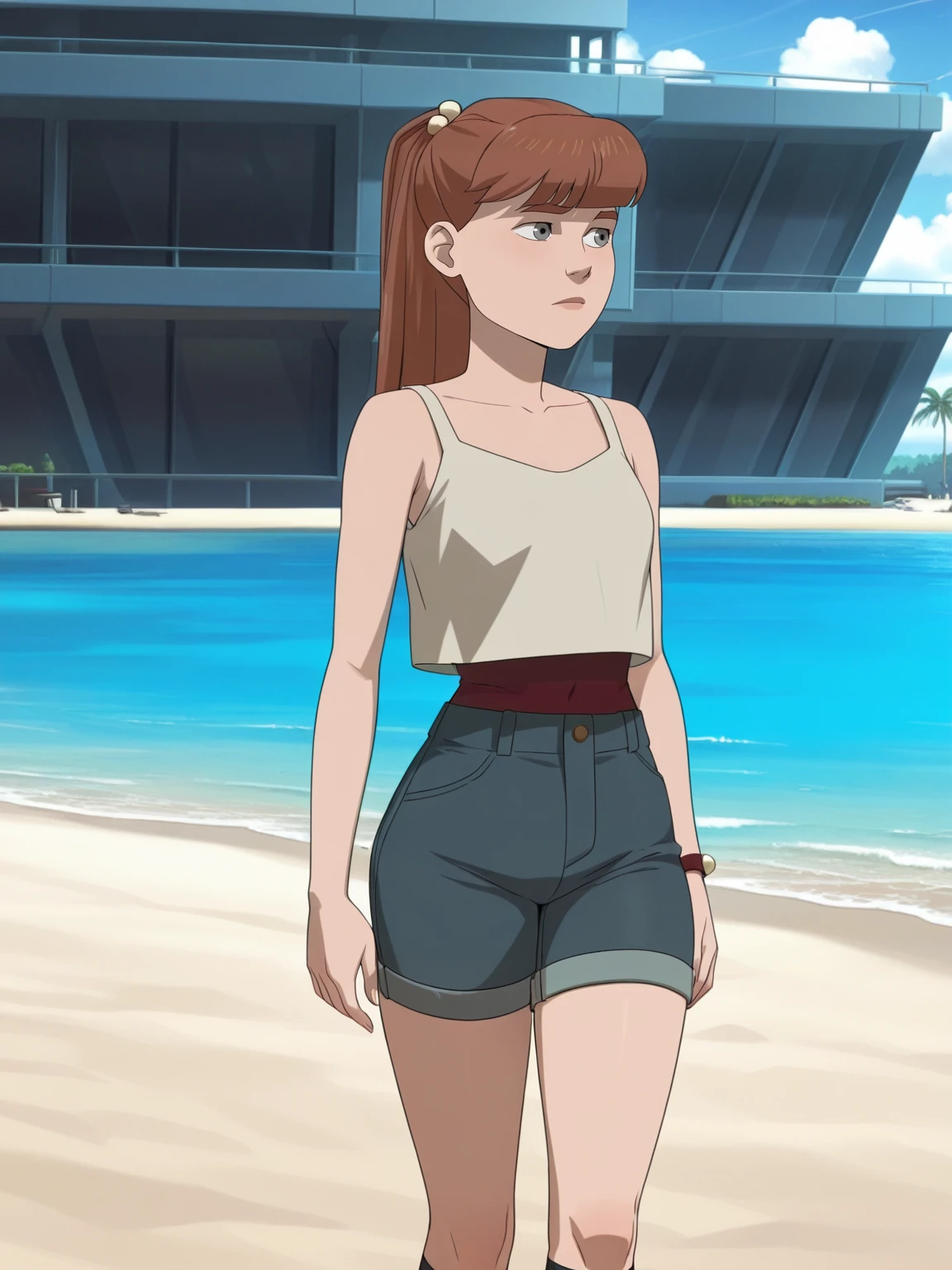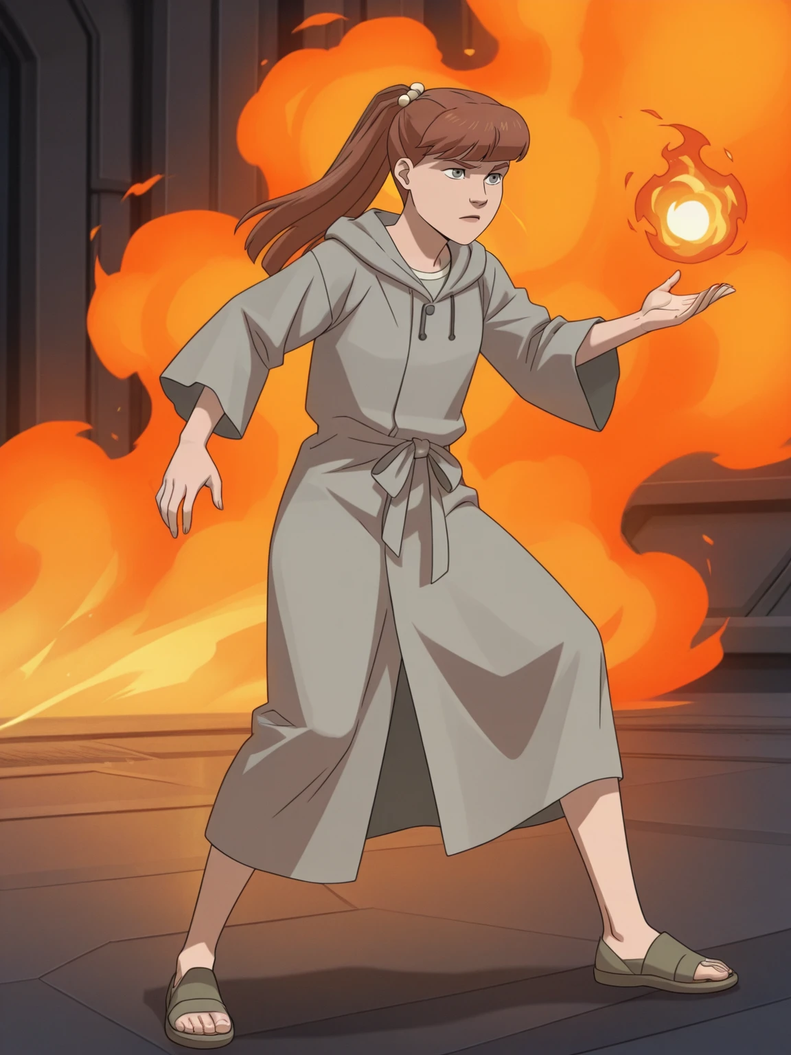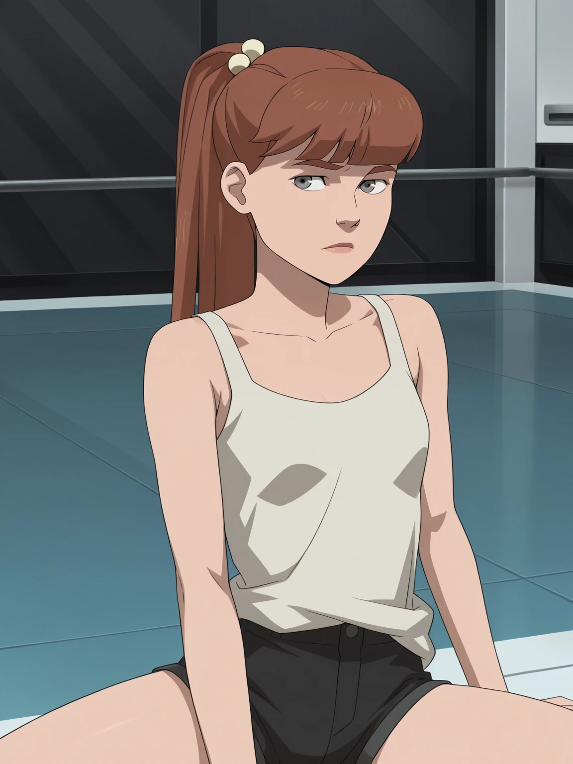 m_g, 1girl, brown ponytail hair, bangs, hairpin, small body, skinny body, grey eyes