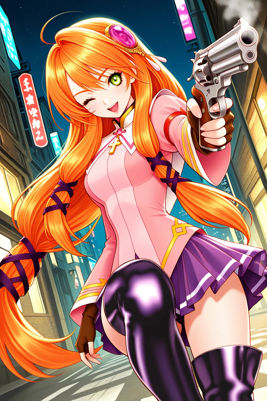 wf_lf, 1girl, solo, green eyes, orange hair, long hair, , lips, low-tied long hair, ribbon, hair ornament, white collar, cross necklace, pink shirt, long sleeves, fingerless gloves, purple skirt, thigh boots,