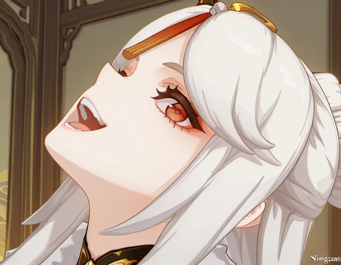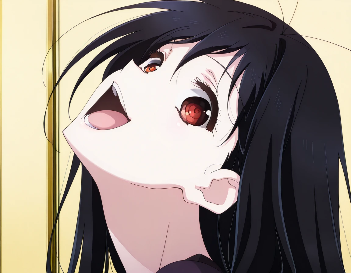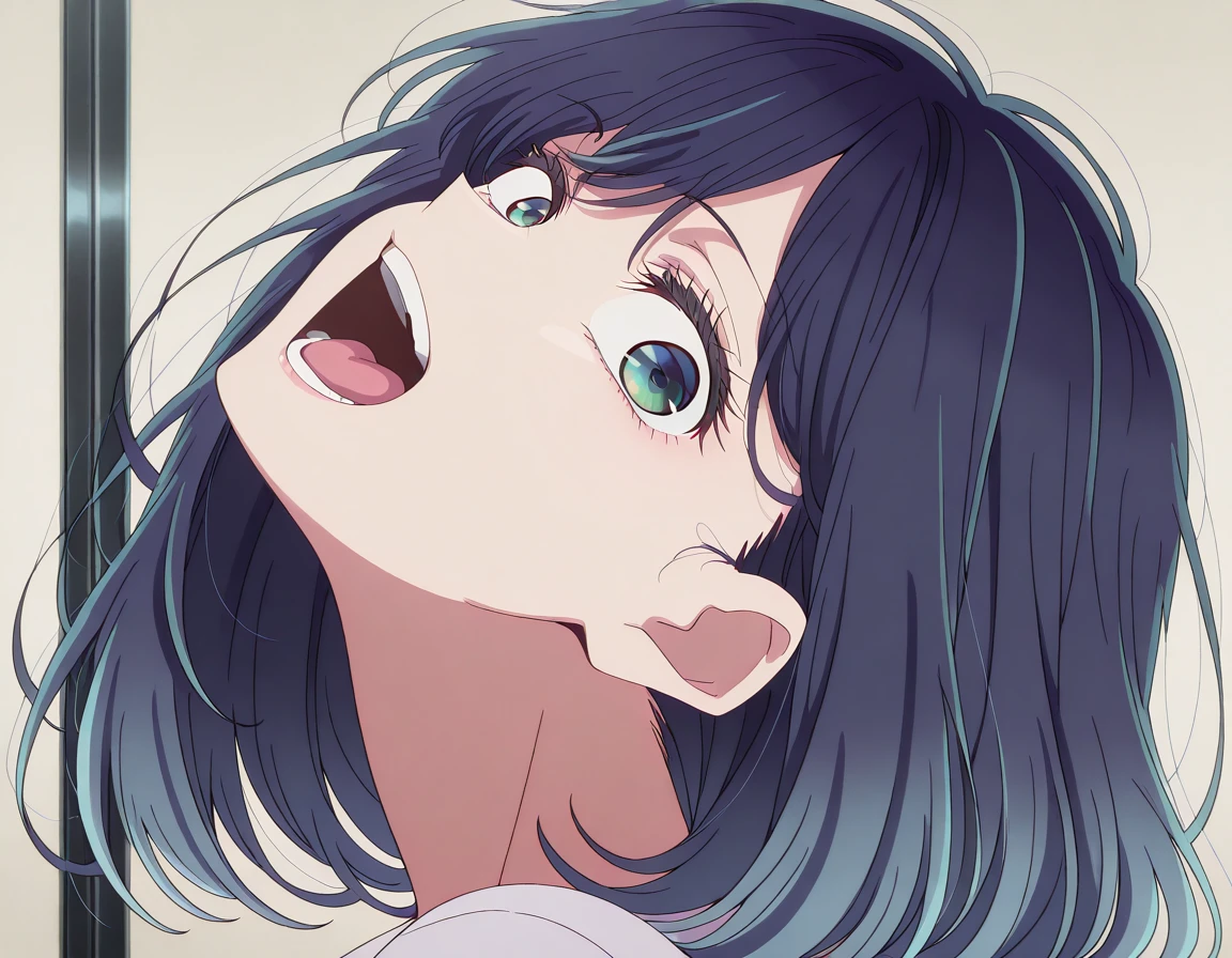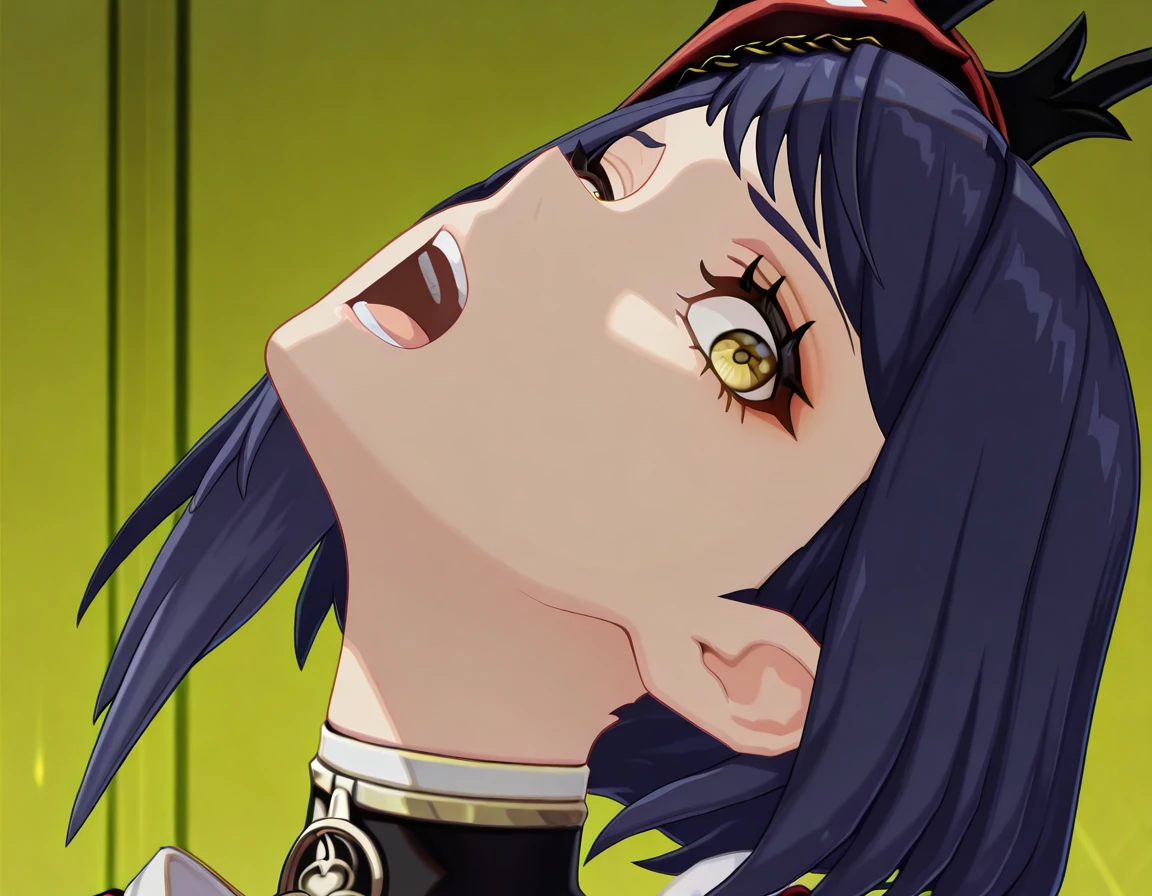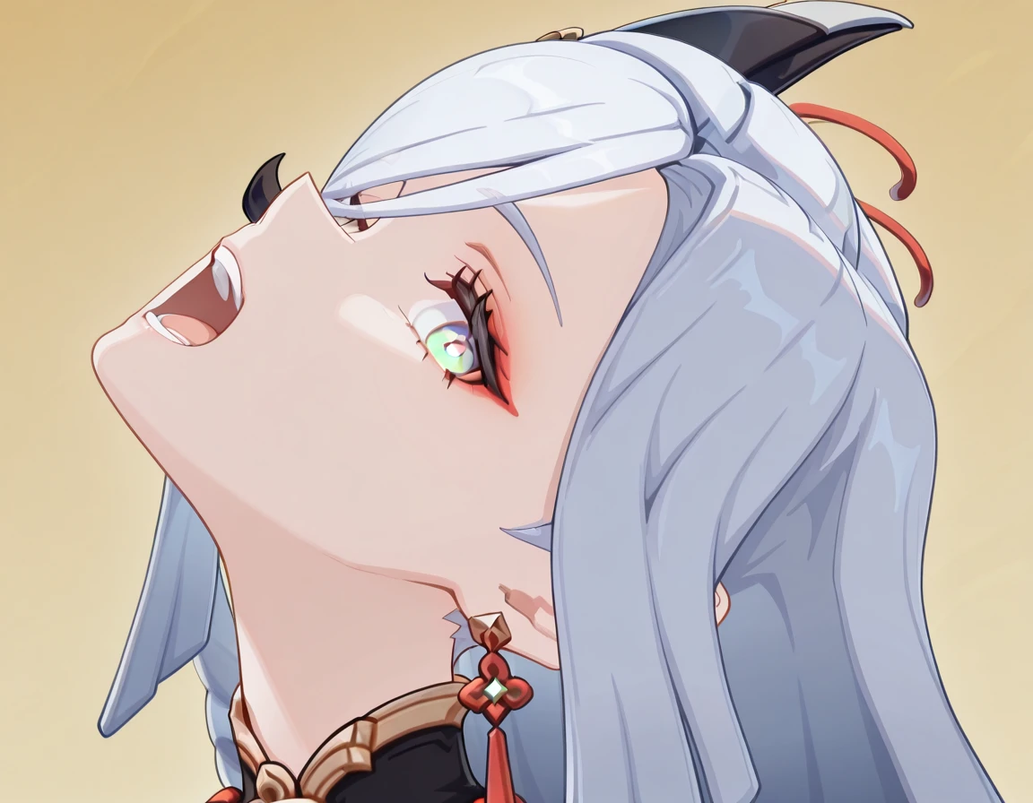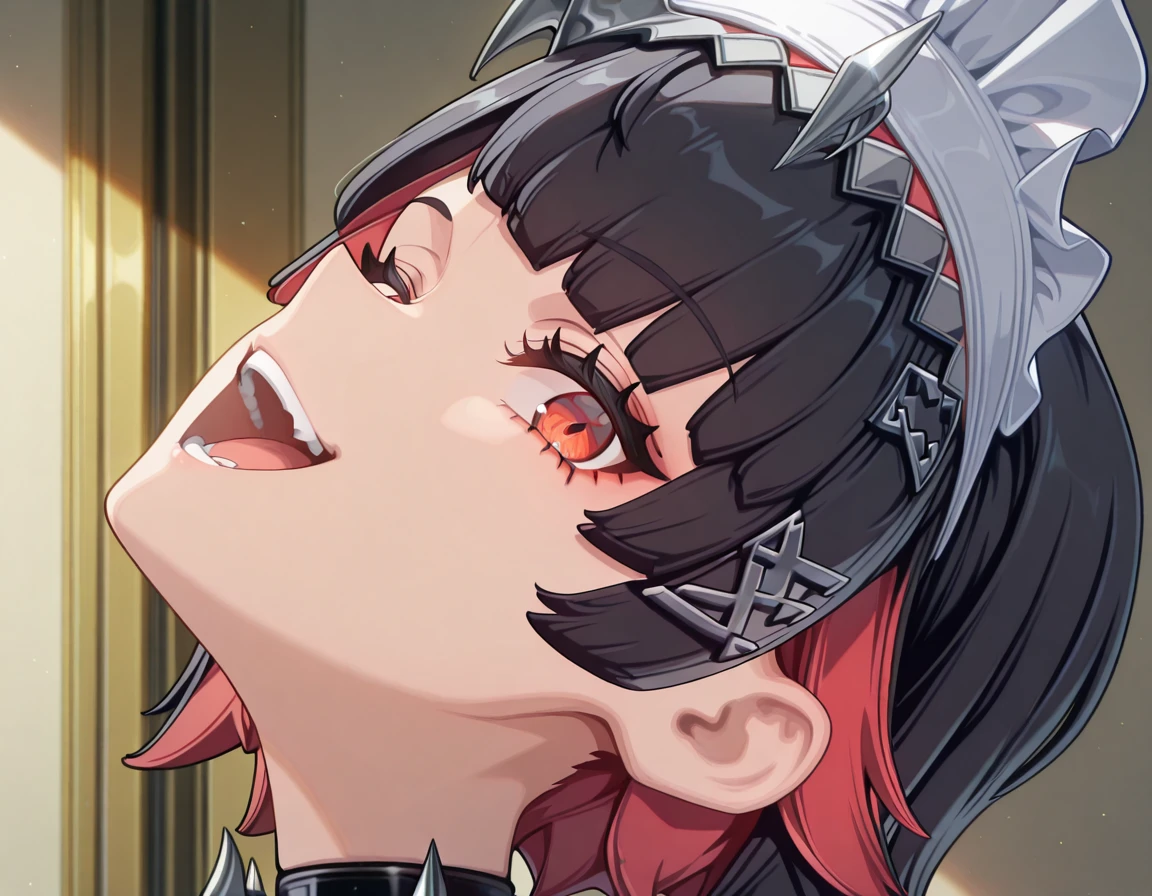 <lora:momoayase-head-back-illustriousxl-lora-nochekaiser:1>, momoayase head back, solo, looking at viewer, open mouth, teeth, tongue, eyelashes, portrait, head back, frown
