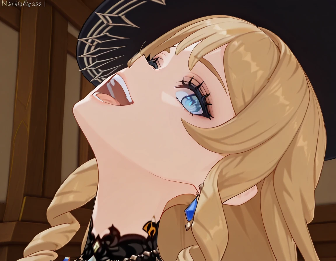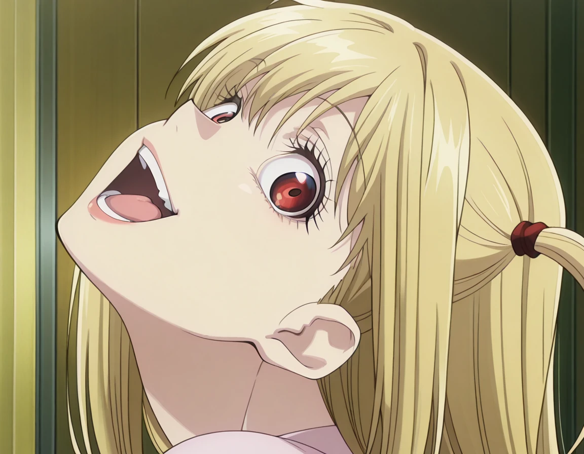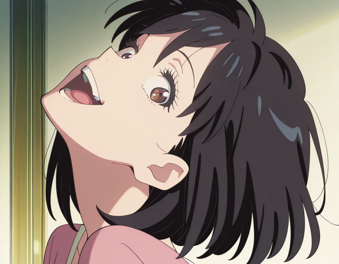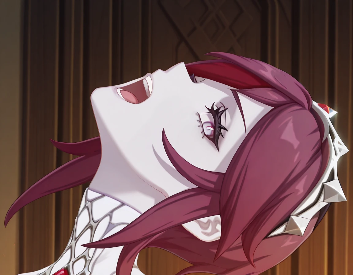 <lora:momoayase-head-back-illustriousxl-lora-nochekaiser:1>, momoayase head back, solo, looking at viewer, open mouth, teeth, tongue, eyelashes, portrait, head back, smile