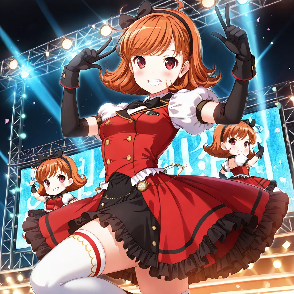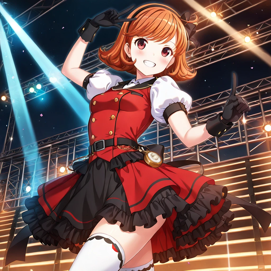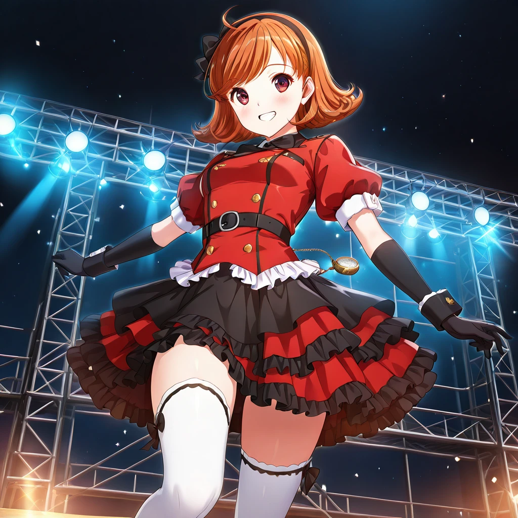 (crimson red dress with black center all the way down to skirt,double layer skirt with upper and lower part,upper skirt black skirt with white ruffles,lower skirt red skirt white ruffles:1.2), glossy black military jacket, (gold buttons surrounded by black:1.2), gold chain, pure white puffy sleeves, pure white frilled skirt, pure white thighhighs, thin red stripes on thighhighs, black elbow gloves, black wrist cuffs, black waist belt, silver belt buckle,gold pocketwatch on skirt