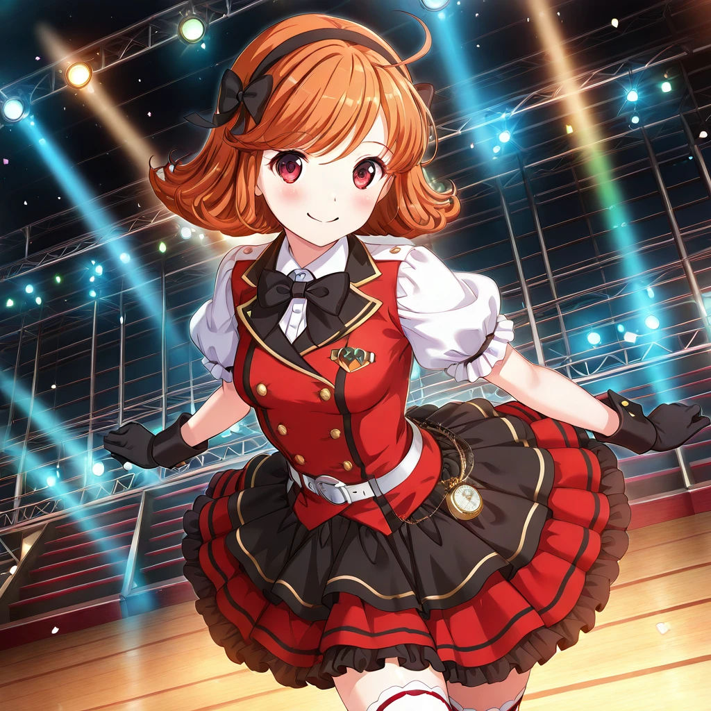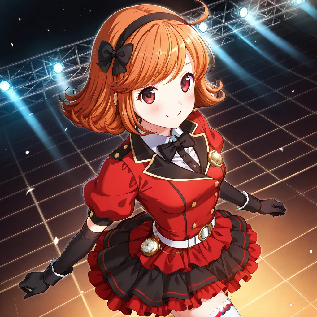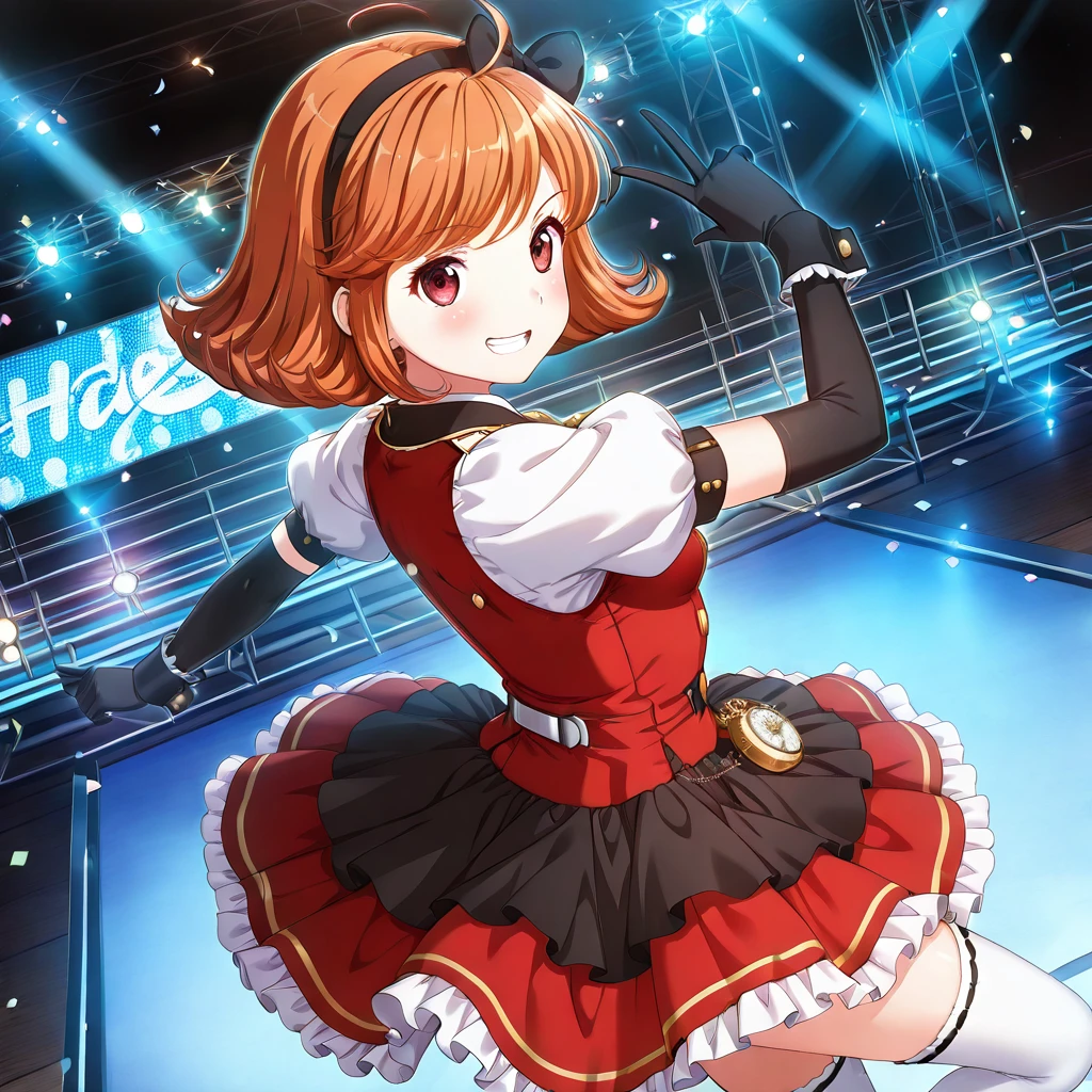 orange bob haircut,fluffy hair, chin-length hair, side-swept bangs,ahoge bangs, large red eyes,(black bow hairband),teenage body,medium small breasts