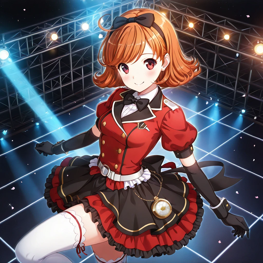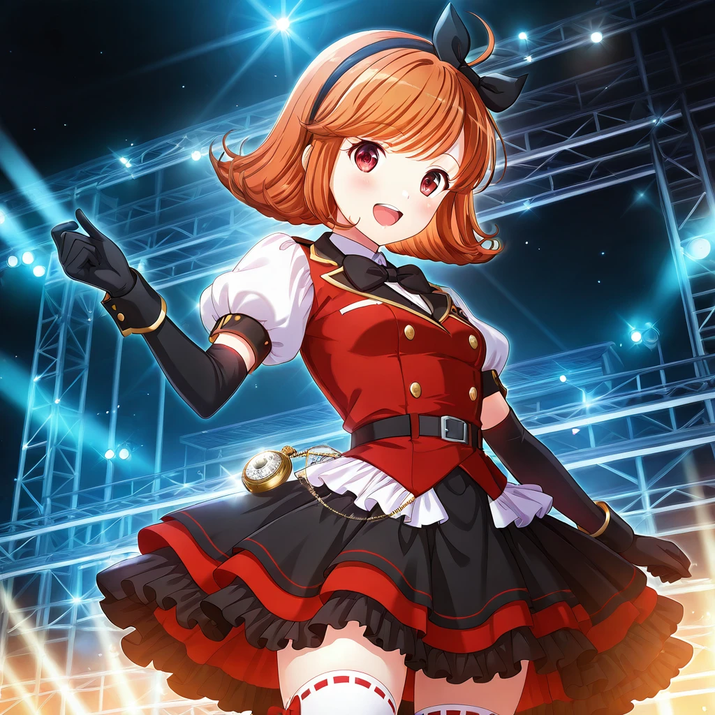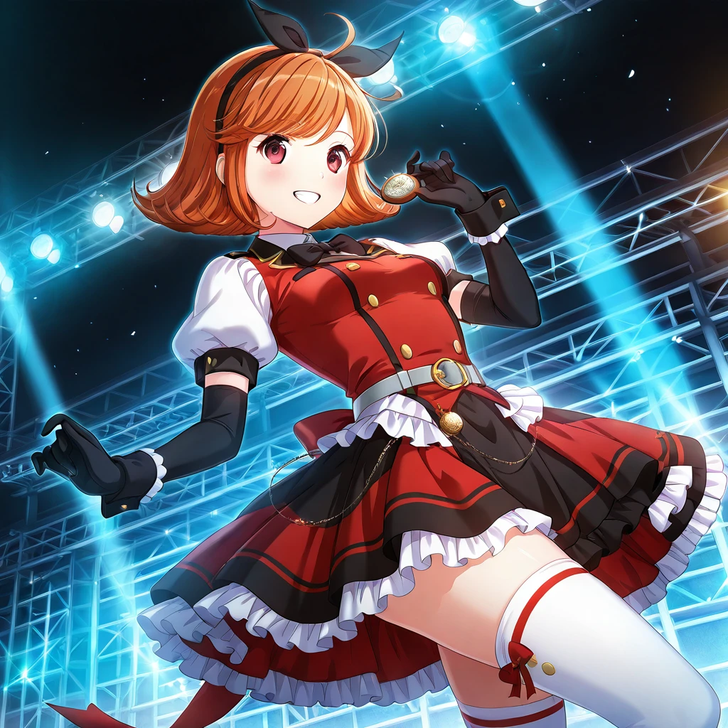 orange bob haircut,fluffy hair, chin-length hair, side-swept bangs,ahoge bangs, large red eyes,(black bow hairband),teenage body,medium small breasts