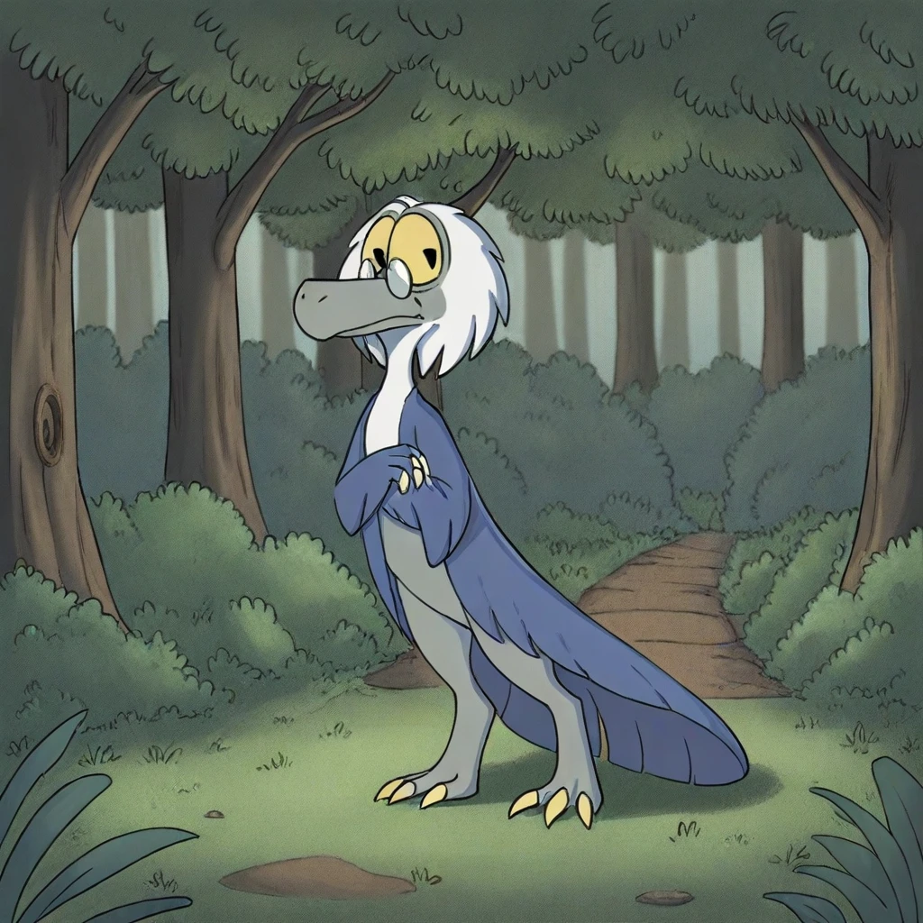 Macrobius, dromaeosaur, male, 3 fingers, 3 toes, raptor legs, blue feathers, claws, white feathers on the head, glasses