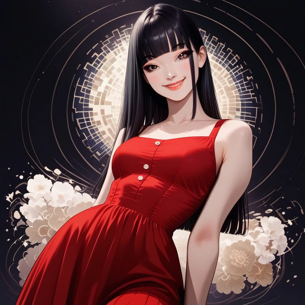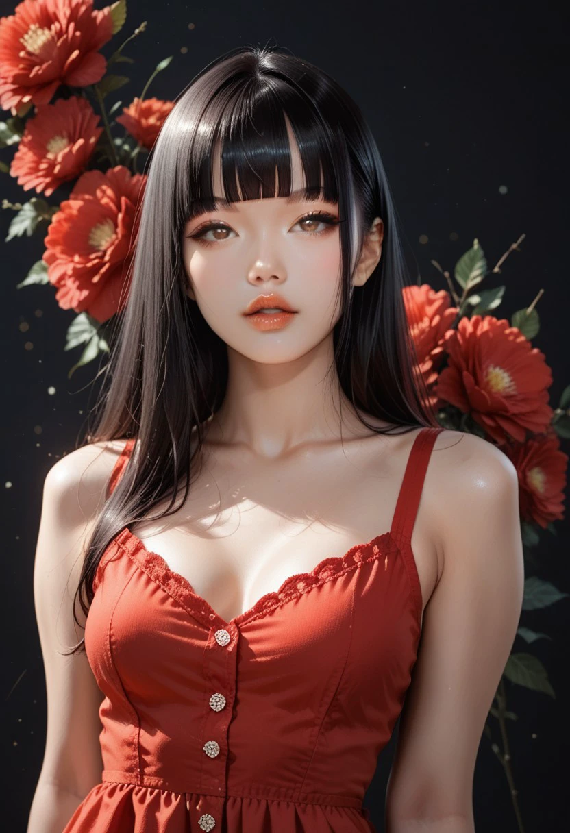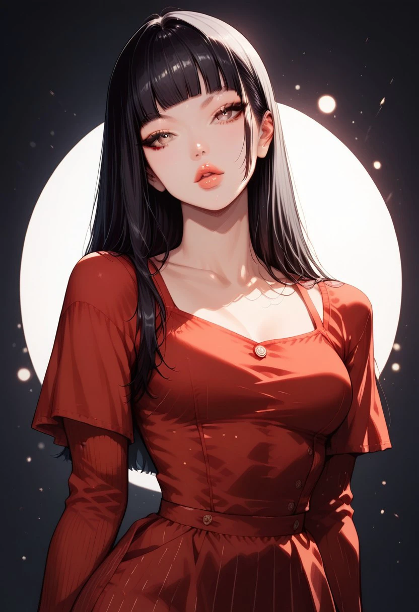 Asian, long black hair, straight hair, blunt bangs, almond eyes, Asian eyes, medium breasts, large hips, slender, natural lips, beautiful lips