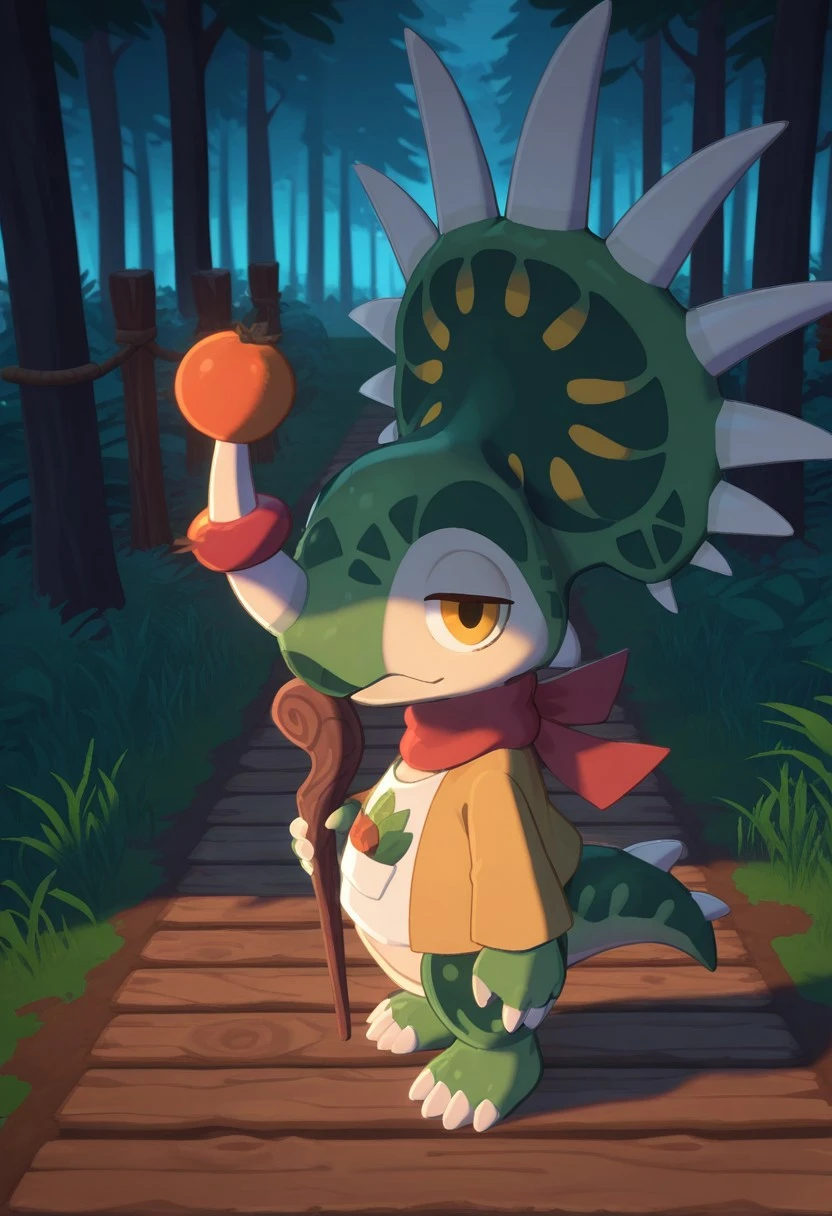 Basil is a Styracosaurus who was once a student of the illustrious chef Elliot Silvertooth, and although he became his equal in terms of skill, Elliot did not approve of his lackadaisical and unconventional attitude when it came to cooking. Elliot wanted him to take a more traditional approach in order to refine his technical skills, but Basil was more interested in the simple joy of food and cooking to make folks happy. Unfortunately, Elliot and Basil butted heads one too many times and now no longer speak to one another. Whilst Elliot continued to be a master chef and restaurateur, Basil became a humble gatherer and merchant, preferring a campfire to a state-of-the-art oven. Unlike his former mentor, Basil is open to new and unconvential flavours in all things - in life and in cooking.