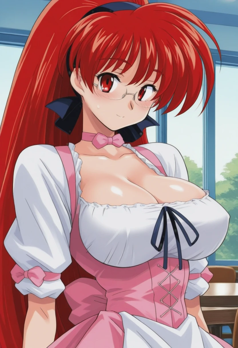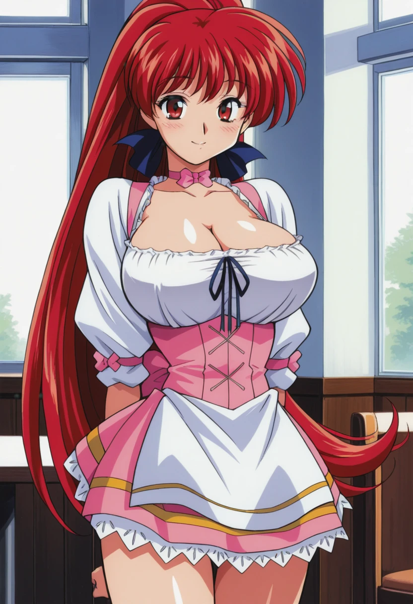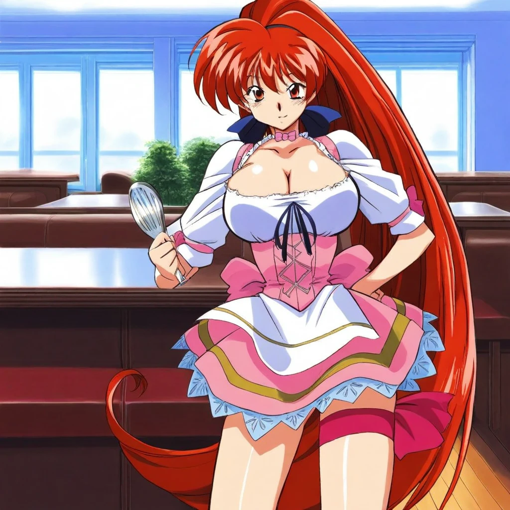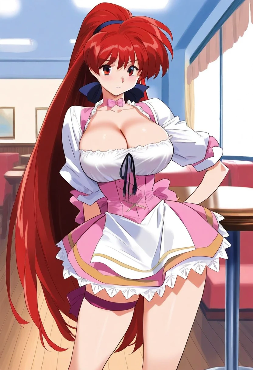 akirail, red hair female, long hair, very long hair, cleavage, waitress, large breasts