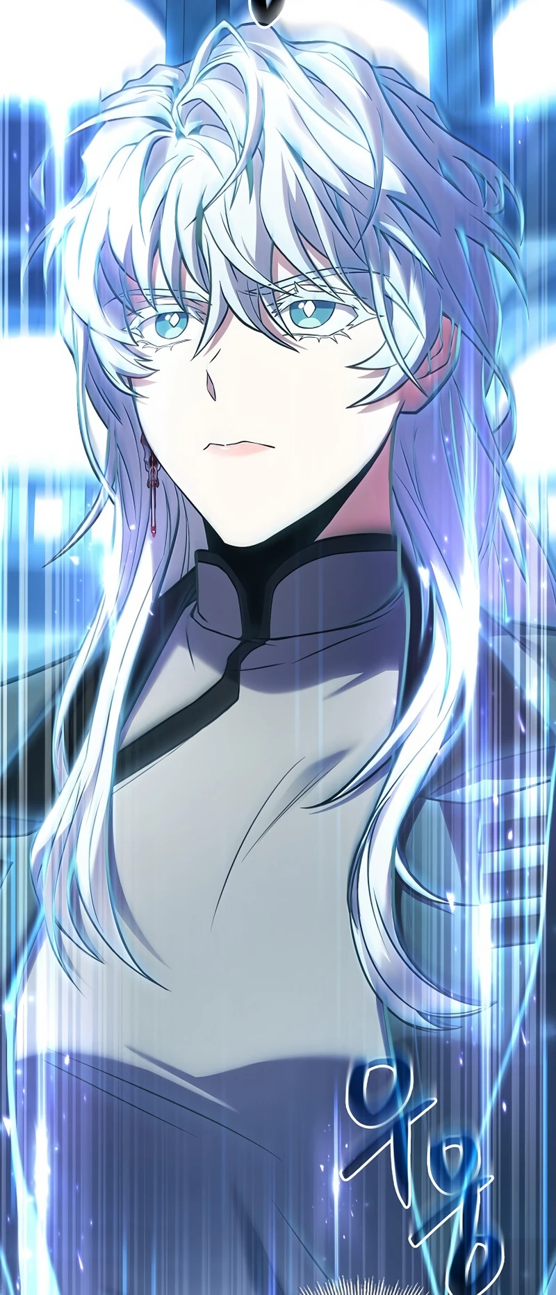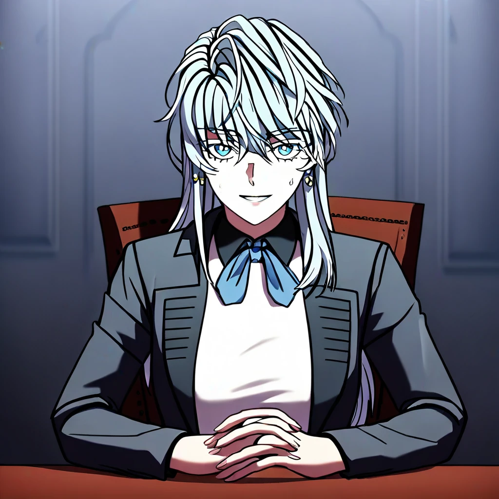 woman, white hair, blue eyes, suit, loose hair, perfect eyes, anime, rating_explicit, shiny skin,light particles,mature female, 1girl,solo,Narrow shoulders,slim body, open clothes, (cleavage:1.4), smiling, looking at viewer, medeuim breast, wet clothes, ?????? Silhouette, wet hair, sweat, heavy breath, full body, light grey hair, blue eyes, darker shade of brown eyebraw, earrings, loose hair, light blue clothes