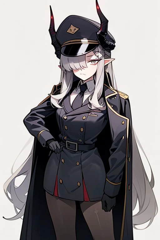 (masterpiece, best quality:1.2), 1girl, solo, bangs, grey hair, hair over one eye, horns, long hair, looking at viewer, one eye covered, short pointy ears, very long hair, closed mouth, vertical pupil, small iris, blue eyes,