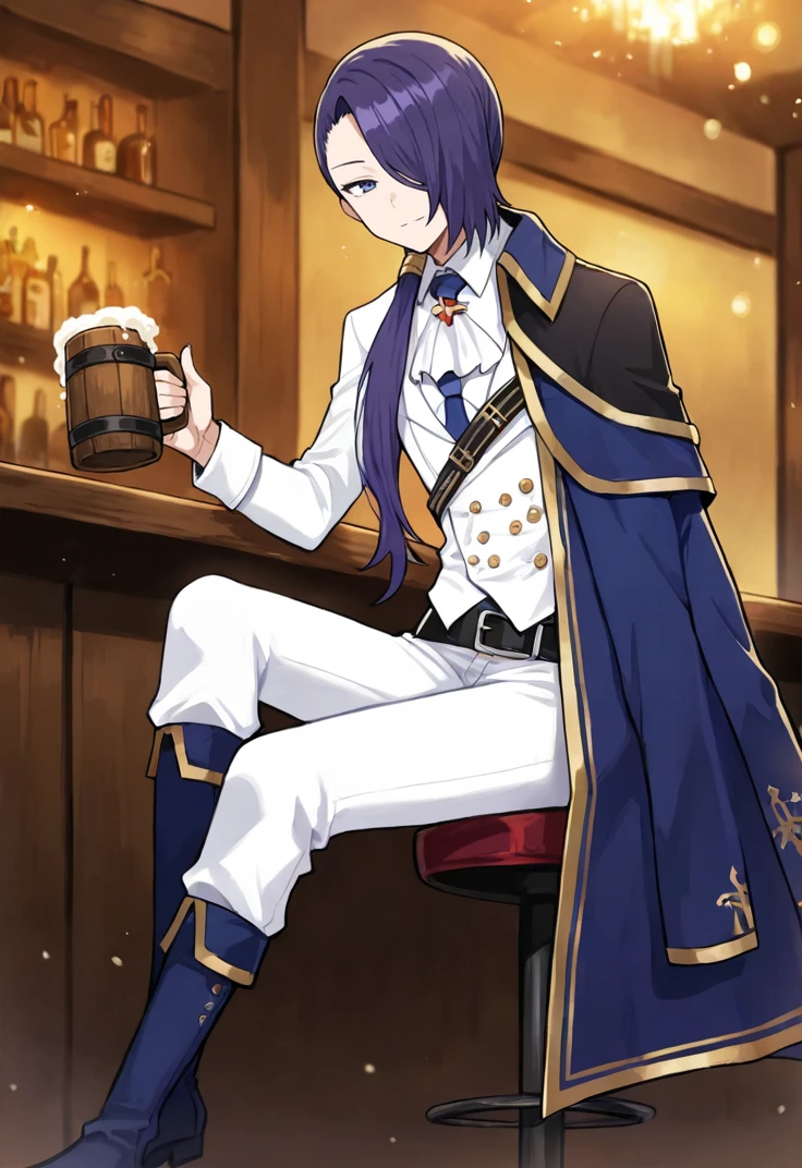 white shirt, white ascot, white jacket, blue necktie, blue coat, purple coat over left shoulder, black belt, black shoulder-belt, white pants, purple knee boots
