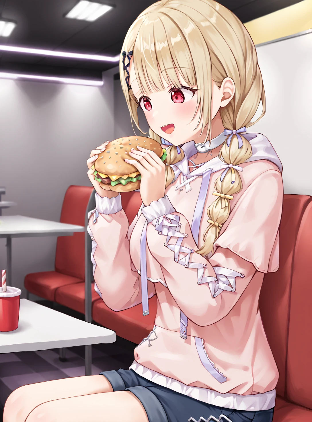 TotoBunkasai, 1girl, solo, twin long braids, choker, hoodie, short denim shorts,