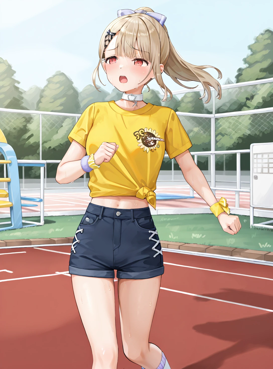 TotoBunkasai, 1girl, solo, ponytail, hair bow, choker, yellow t-shirt, short denim shorts, shoulder bag, phone,
