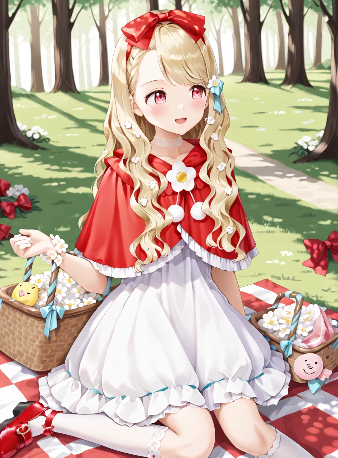 TotoRedHood, 1girl, solo, wavy long hair, blonde hair, red hair bow, swept bangs, white dress, red capelet,