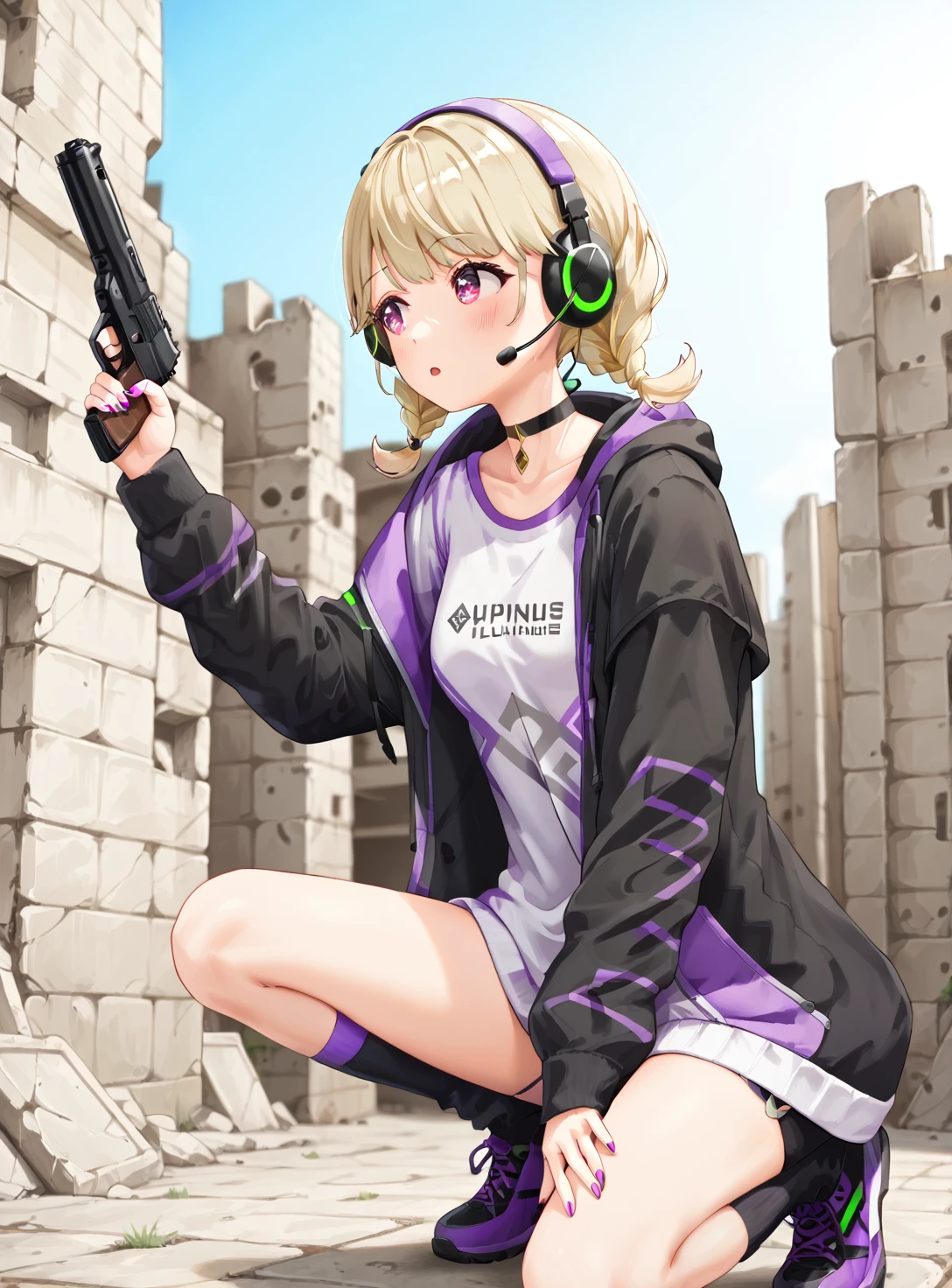 TotoGamer, 1girl, solo, twin short braids, white shirt, black open jacket, headphones,