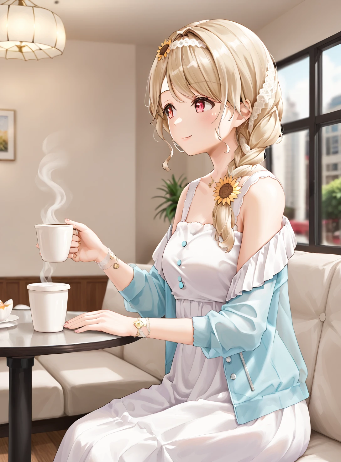 TotoOnePiece, 1girl, solo, braided ponytail, hair over shoulder, white One-Piece dress, blue open jacket,
