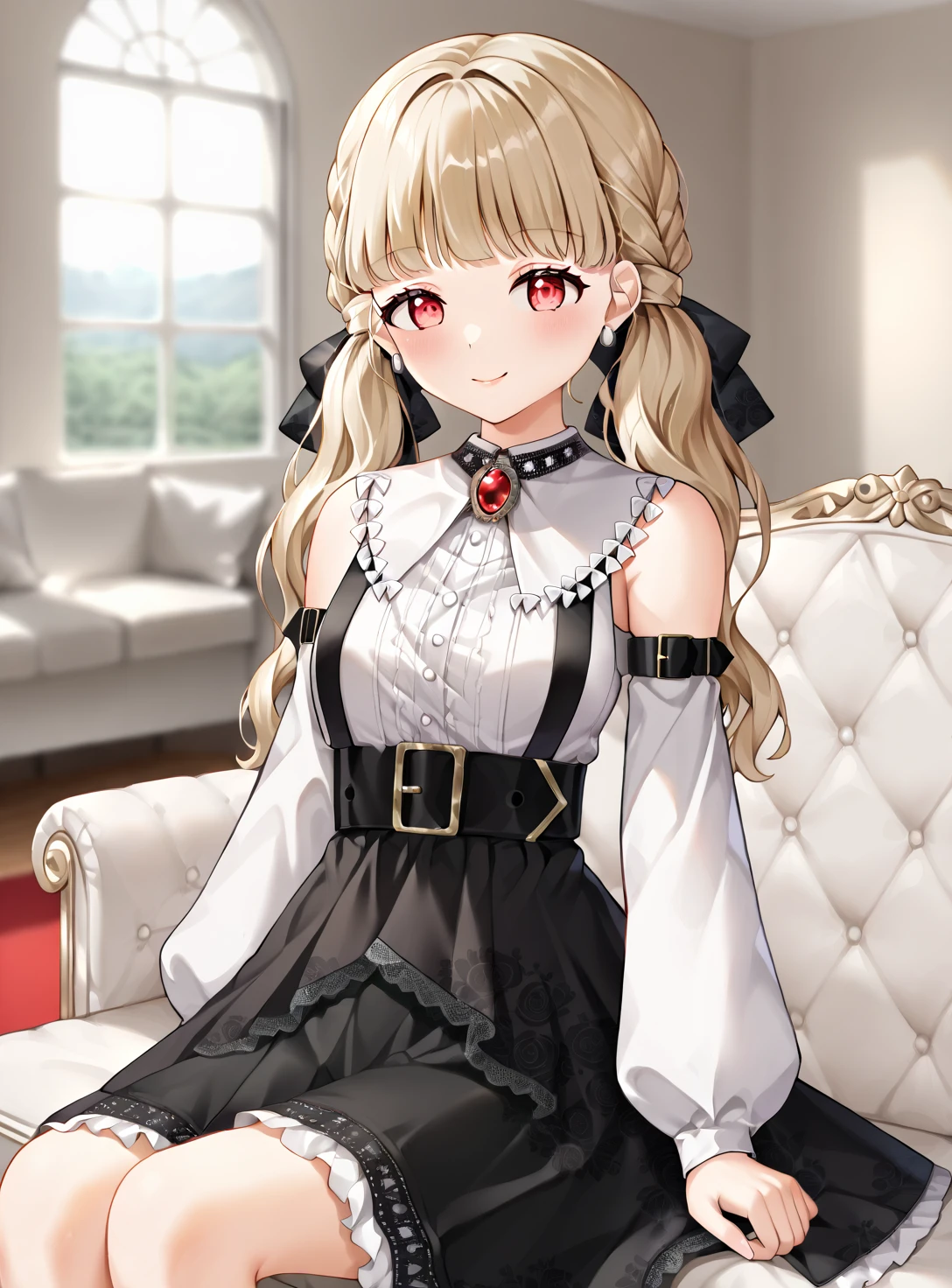TotoGothic, 1girl, solo, low twintails,medium hair, white shirt, black high-waist suspender skirt, detached sleeves,Black inner skirt