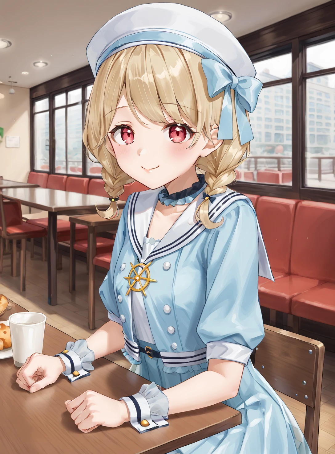 TotoSailor, 1girl, solo, twin short braids, blue serafuku, blue layered skirt, sailor hat,