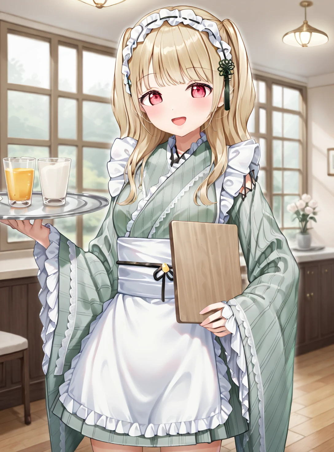 TotoMaid, 1girl, solo, two side up, medium hair, short green kimono, maid apron, maid headdress, tassel hair ornament,