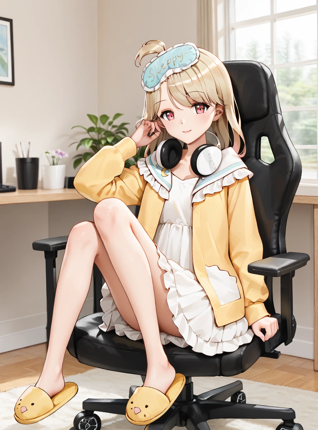 TotoPajama, 1girl, solo, medium hair, white dress, yellow open pajamas, sleep mask, headphones around neck,