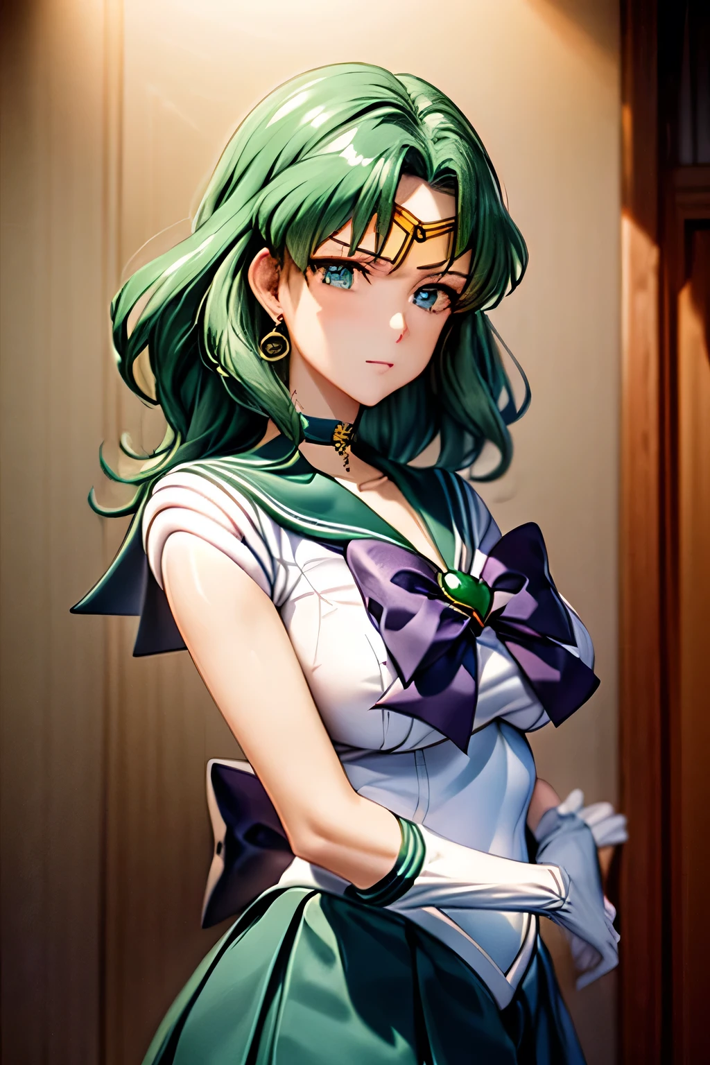 circlet, jewelry, earrings, choker, sailor senshi uniform, green sailor collar, chest bow, back bow, plead skirt, green skirt, white elbow gloves,
