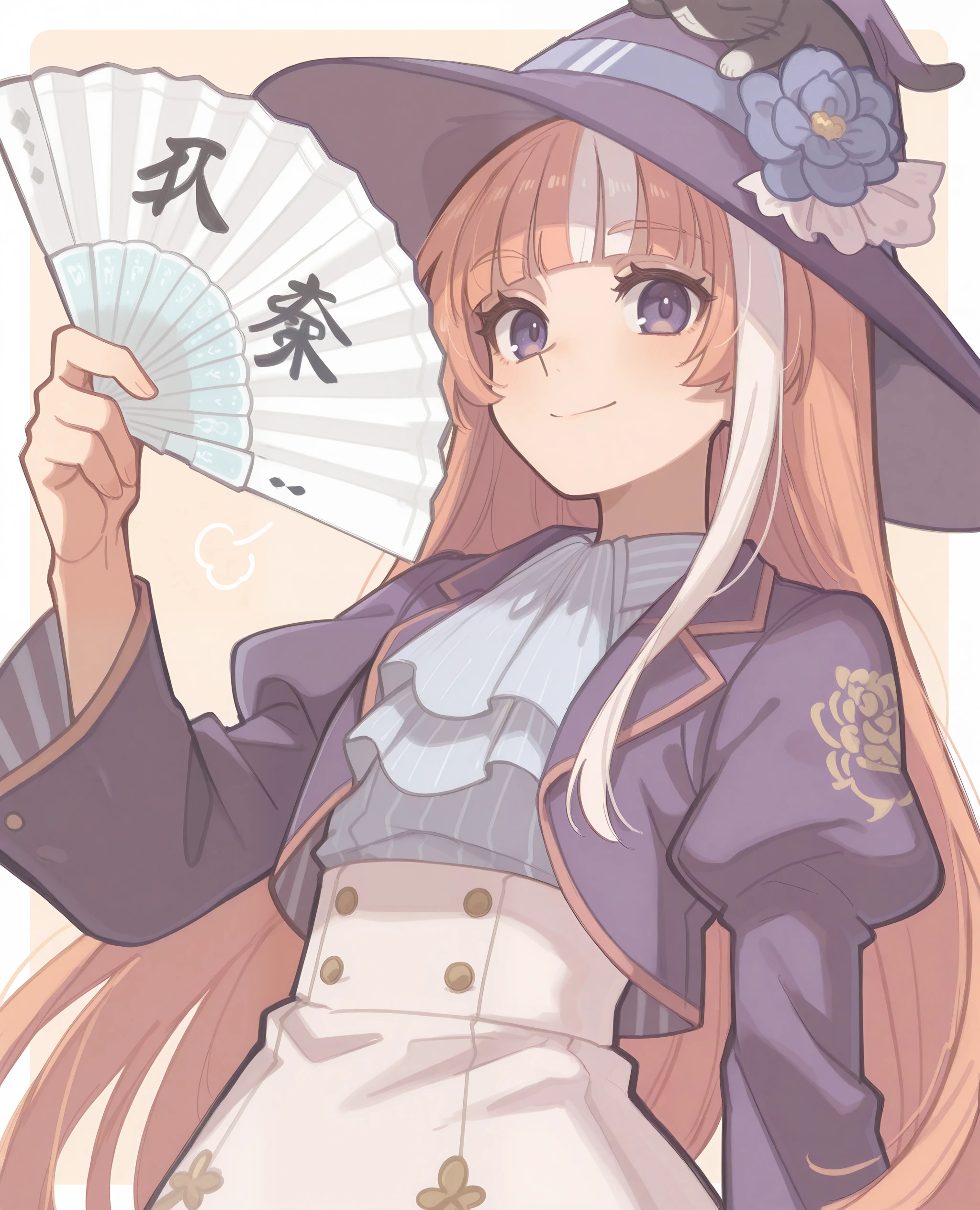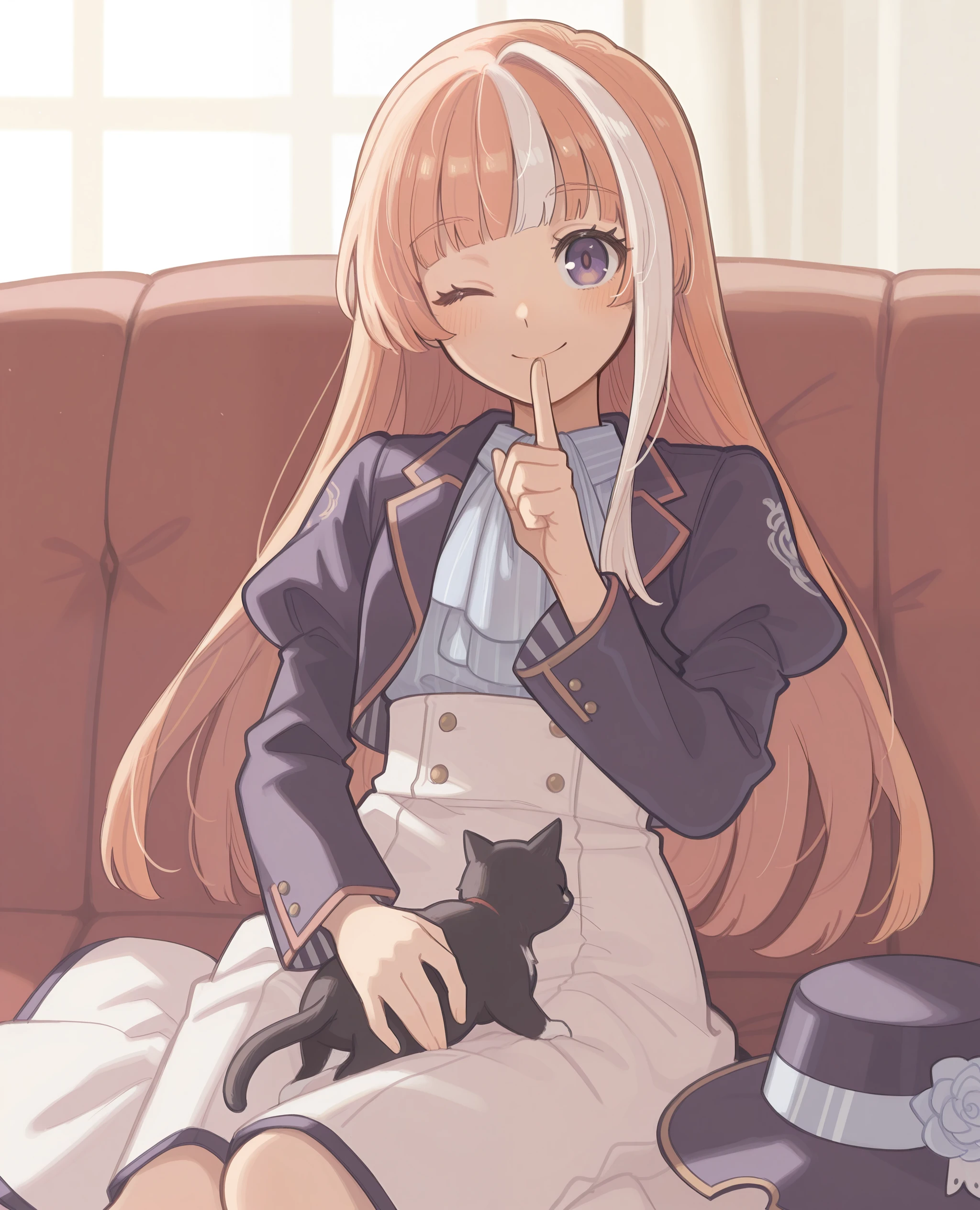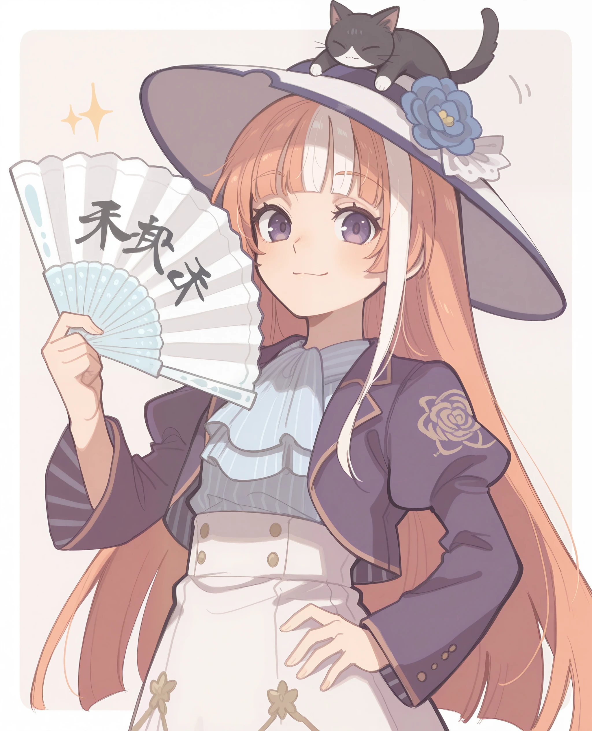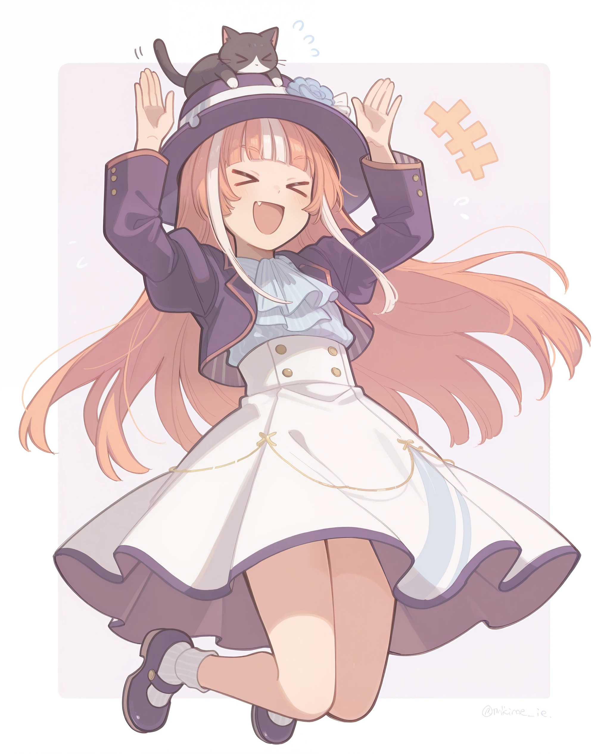purple jacket, puffy sleeves, white frilled shirt, ascot, white dress, high-waist skirt, cat_on_hat, white socks, purple_shoes, mary janes,
