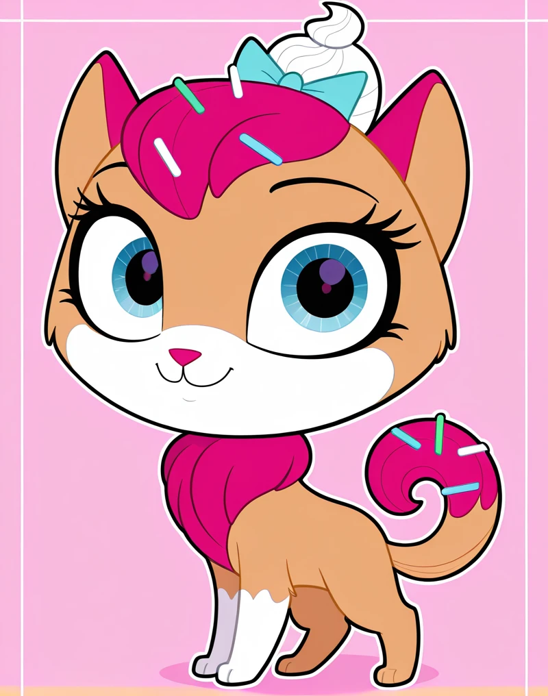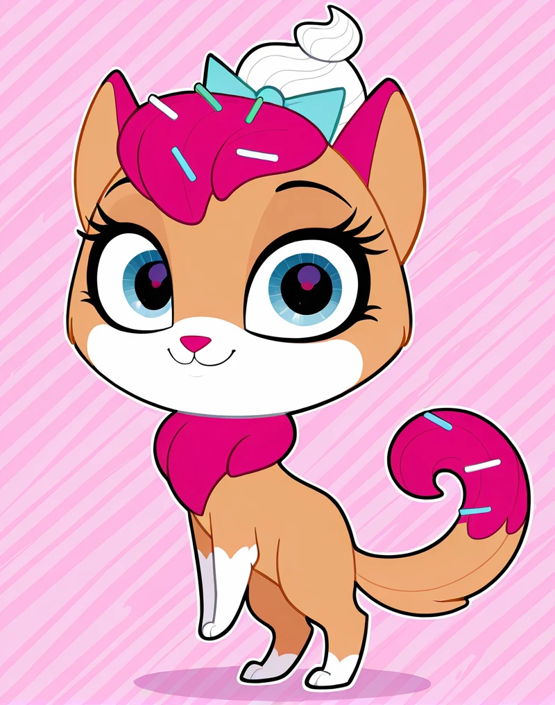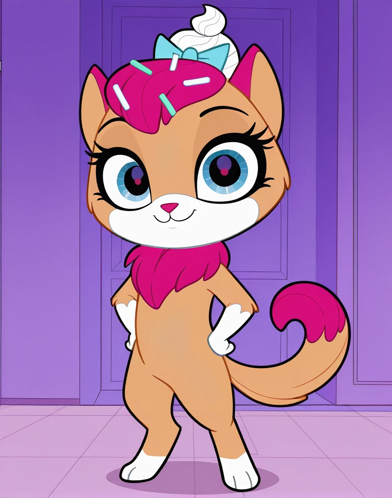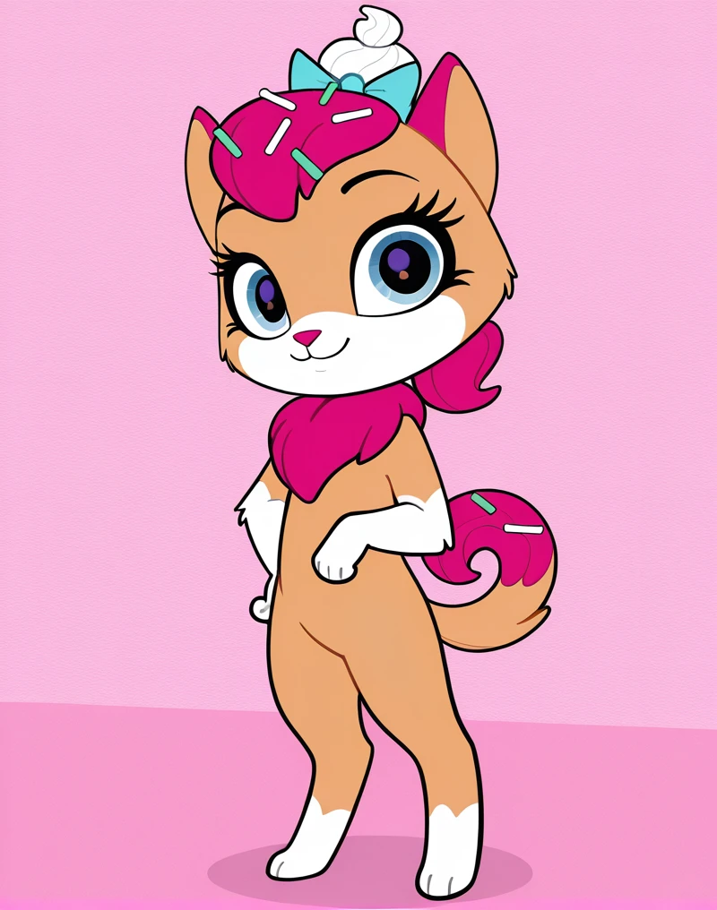 SugaSprink, cat, pink hair, semi-anthro, beige fur, hairclip, hair ornament, two-tone fur, blue eyes, bow, furry, 1girl, furry female