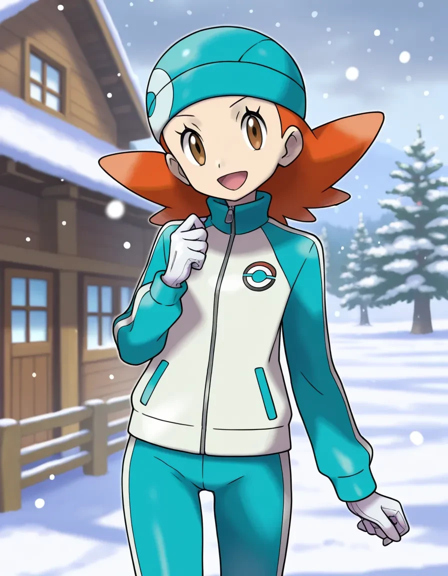orange hair,red hair,long hair,flipped hair,aqua headwear,aqua swim cap,track jacket,aqua jacket,white jacket,long sleeves,white gloves,aqua pants,medium hair,belt,