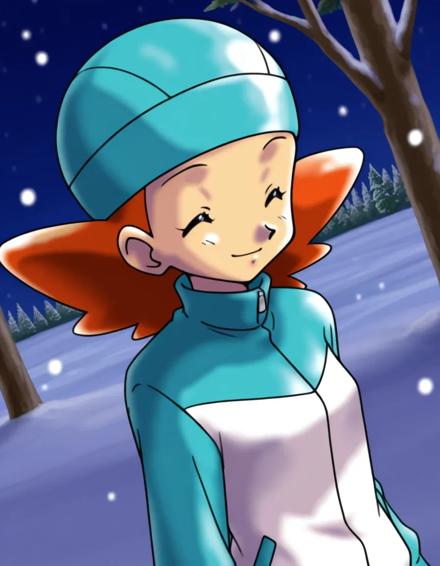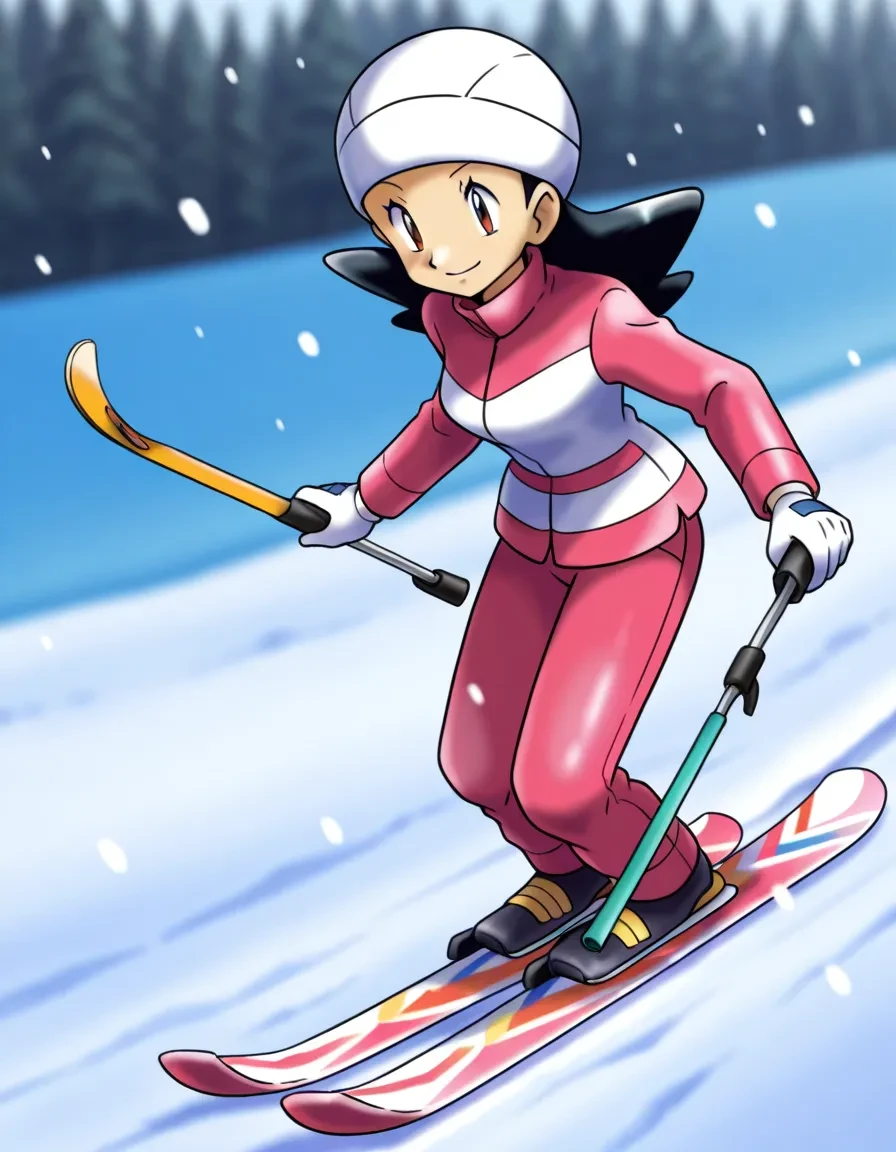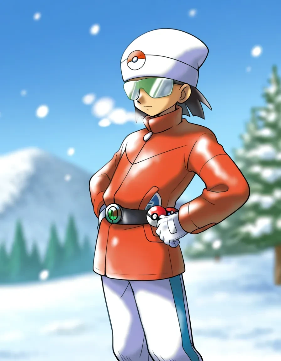 black hair,short hair,green-tinted eyewear,opaque glasses,ski goggles,sunglasses,white headwear,beanie,white gloves,red bomber jacket,long sleeves,white pants,red footwear,belt,waist poke ball,poke ball print,winter clothes,