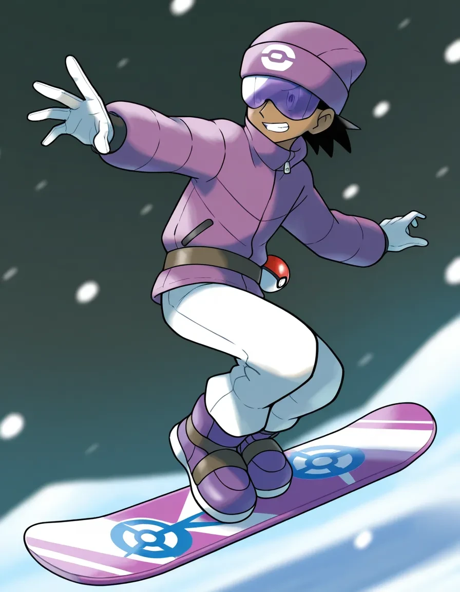 black hair,short hair,purple-tinted eyewear,opaque glasses,ski goggles,sunglasses,dark skin male,purple headwear,beanie,white gloves,purple bomber jacket,long sleeves,white pants,purple footwear,belt,waist poke ball,poke ball symbol,winter clothes,