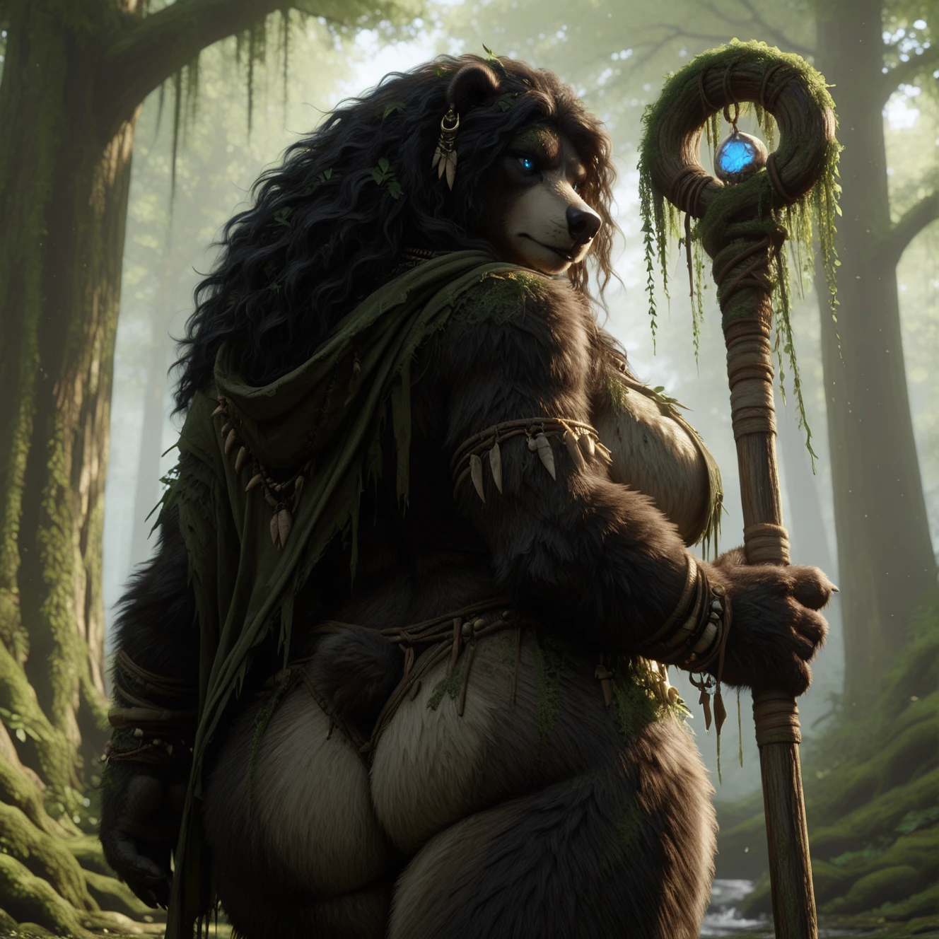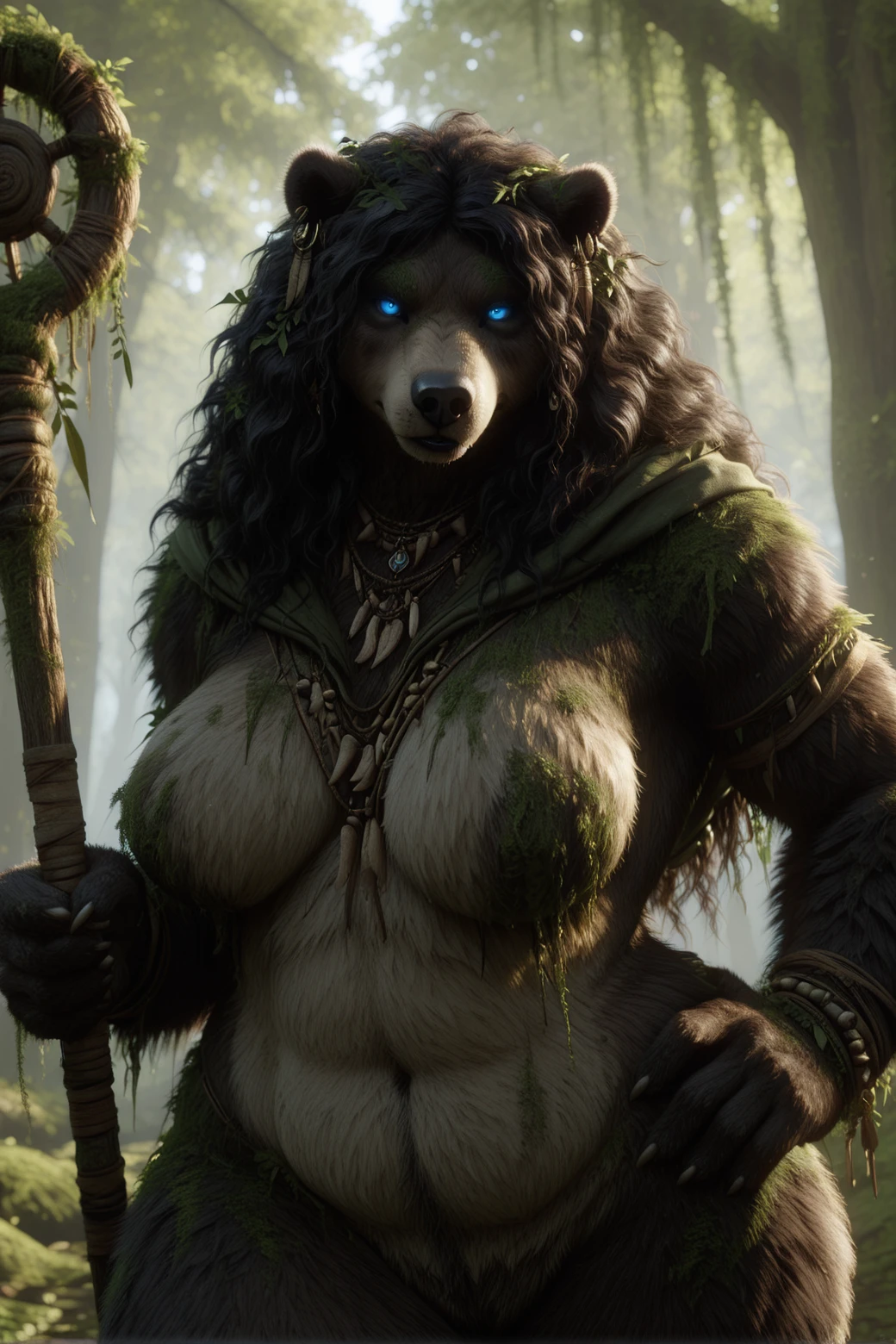 6ru1d_b3ar, anthro, solo, female, bear, black nose, shaggy hair, long hair, wavy hair, messy hair, moss, two tone body, huge breasts, heavy breasts, brown fur, necklace, black hair, hair on shoulders, black lips, fluffy, animal ears, finger claws, voluptuous, wide hips, outside, forest, nature, backlighting, covered in leaf, ear jewelry, tribal necklace, nub tail, druid, white snout, glowing eyes, thick thighs, leaf in hair, shaggy fur, blue eyes, slightly chubby female, crotch tuft, standing, featureless breasts,