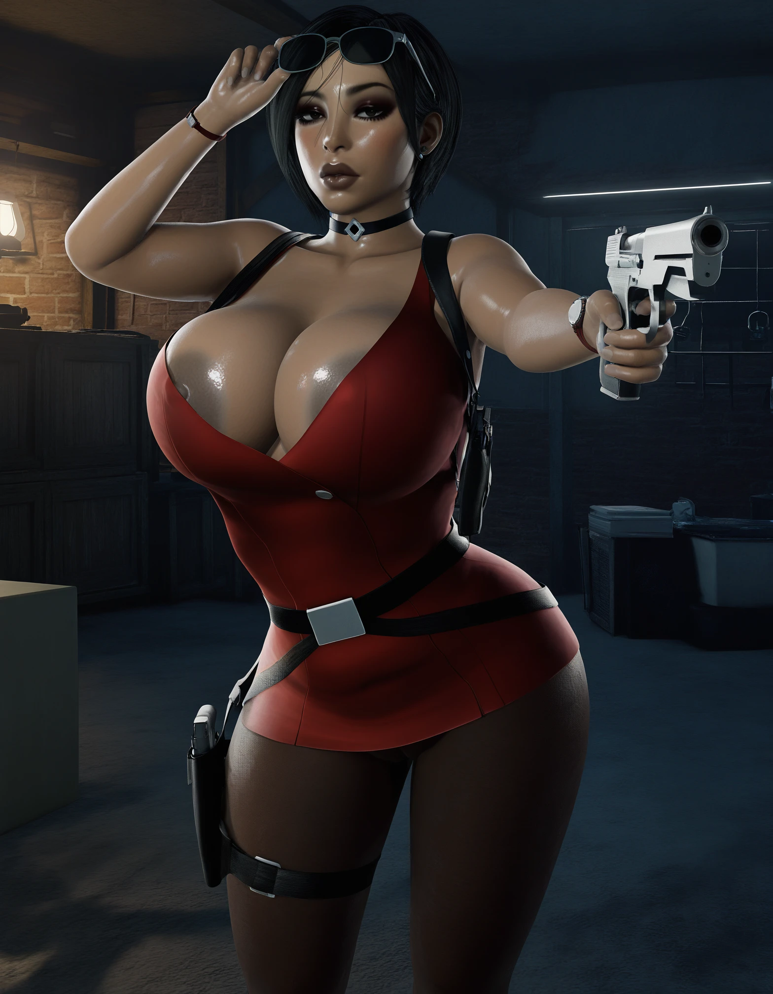 Ada Wong, mature female, brown eyes, short hair, black hair, thick lips, black choker, red dress, short dress, bare shoulders, wristwatch, thigh holster, pantyhose, brown pantyhose, high belt,