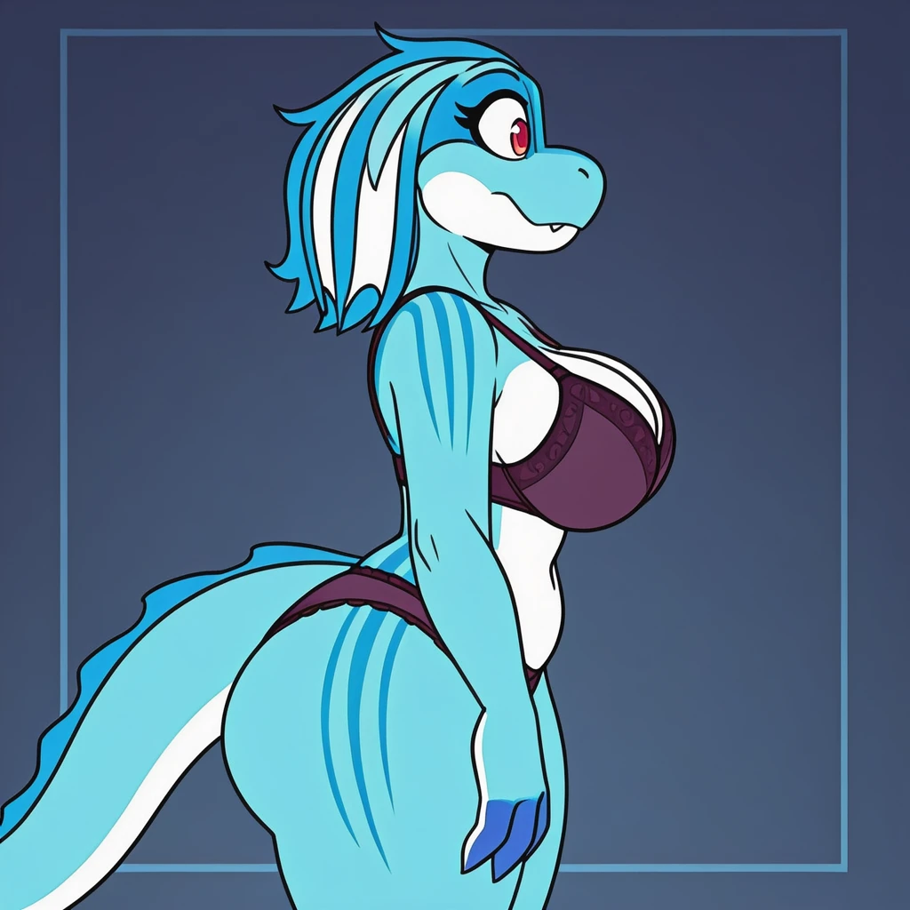 Blueberry is blue skinned with a white frontal countershading pattern. Her long tail has blue spikes that extend up her back to her neckline. Cannonically, she has dark blue clawed fingers, but some renditions use blue colored fingers instead.