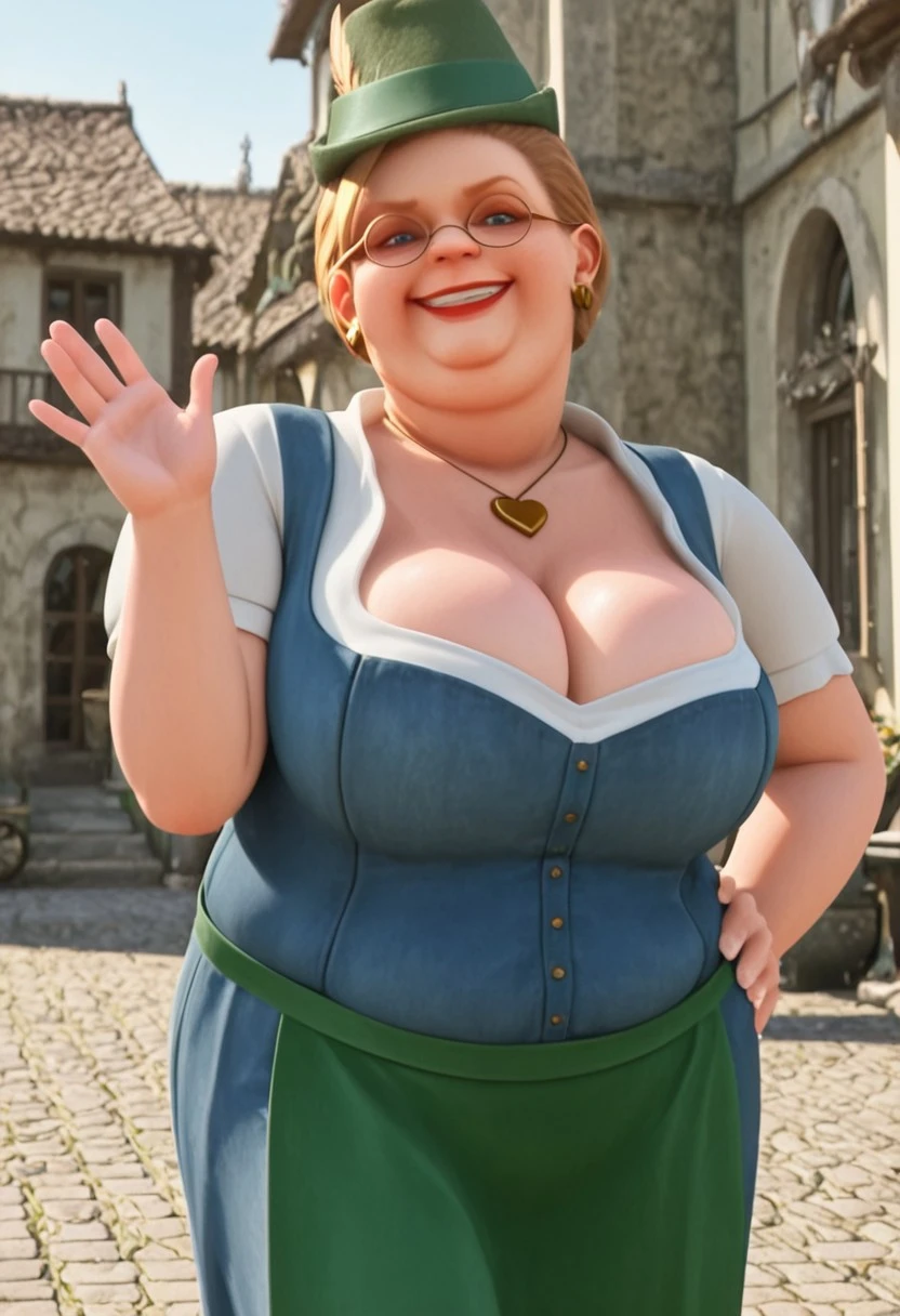 protzler_rtzbb, 1girl, old, plump, chubby, green tyrolean hat (golden feather), light brown hair, updo, blond eyebrows, round glasses, blue eyes, golden earrings red lipstick, double chin, jewelry, golden heart necklace, big chest, blue dress (white shirt, white sleeves, green apron), cleavage, black mary janes,