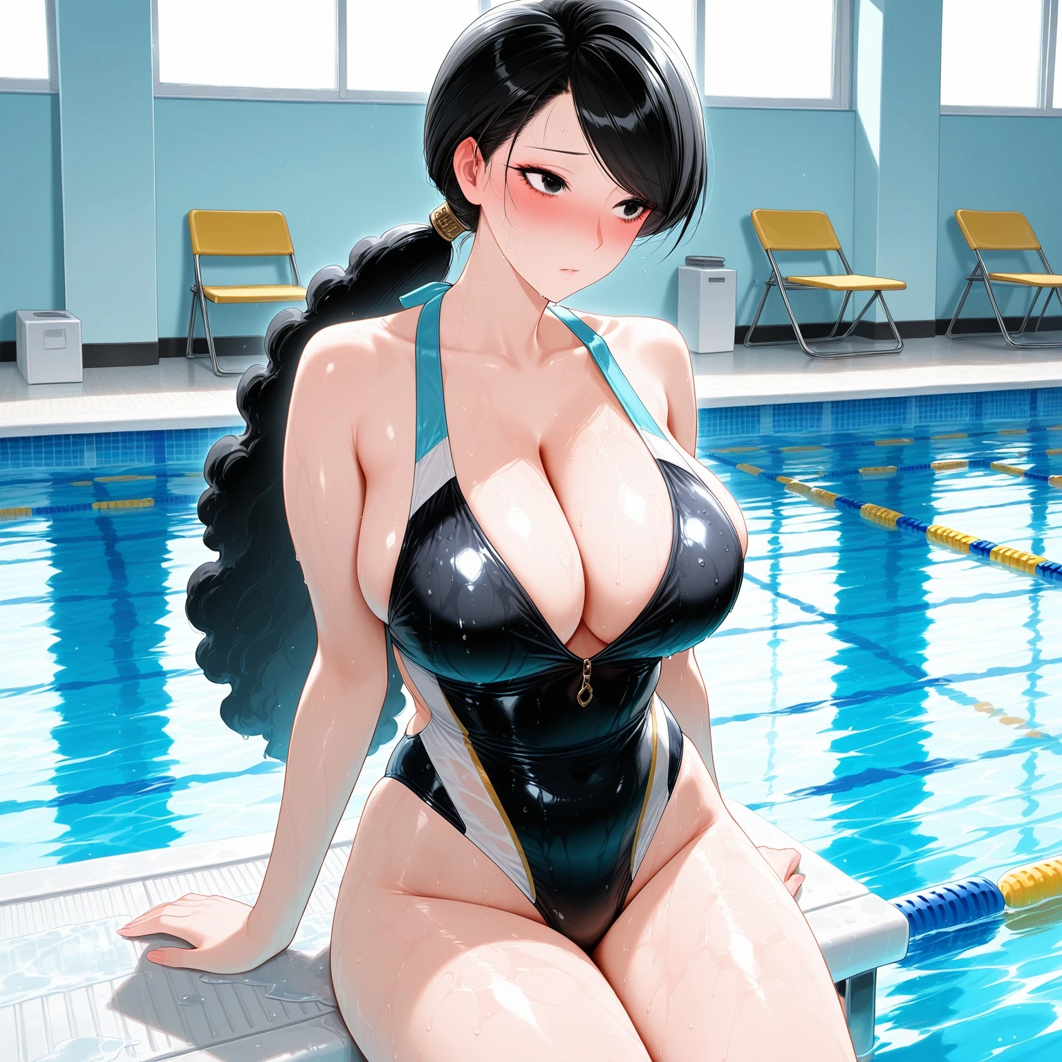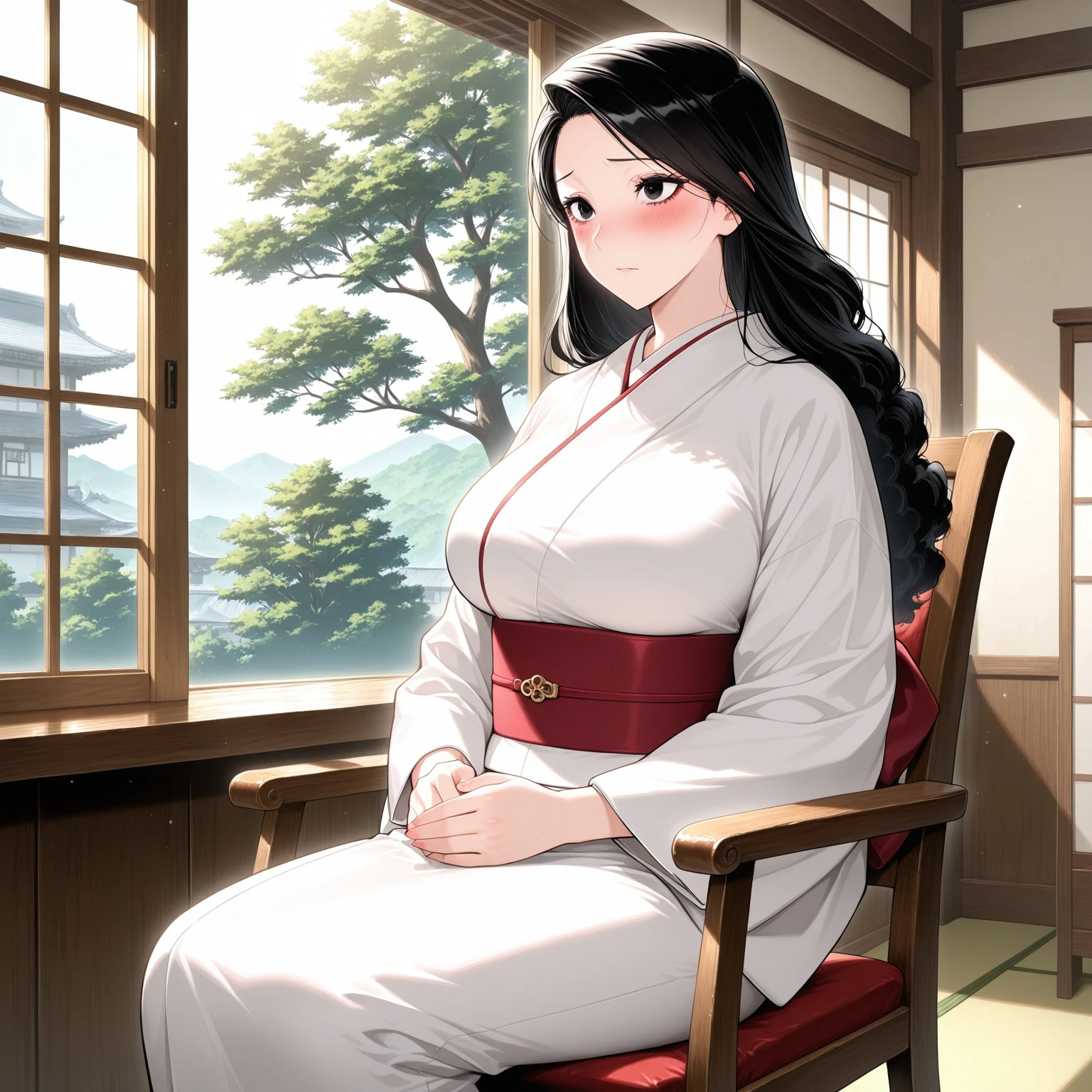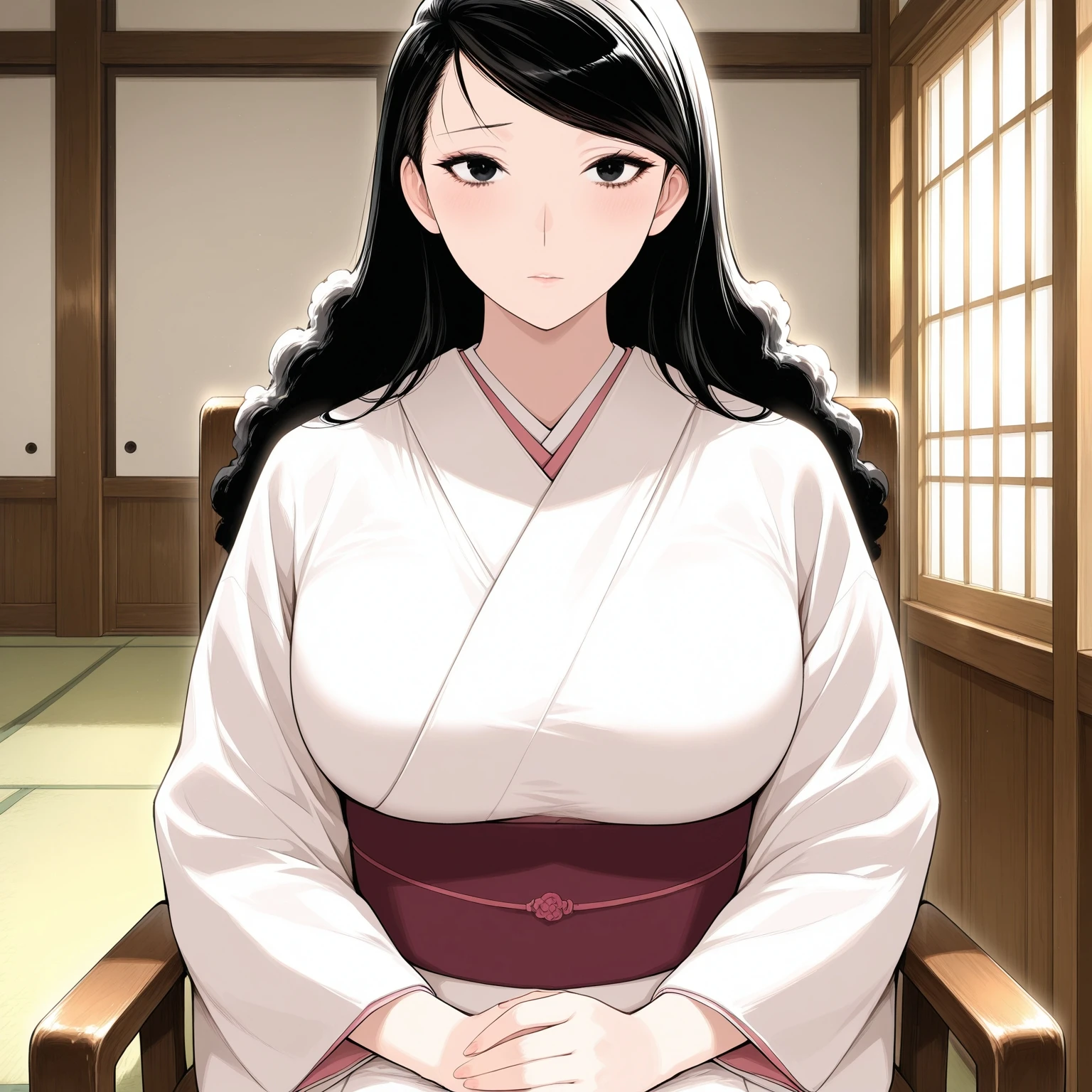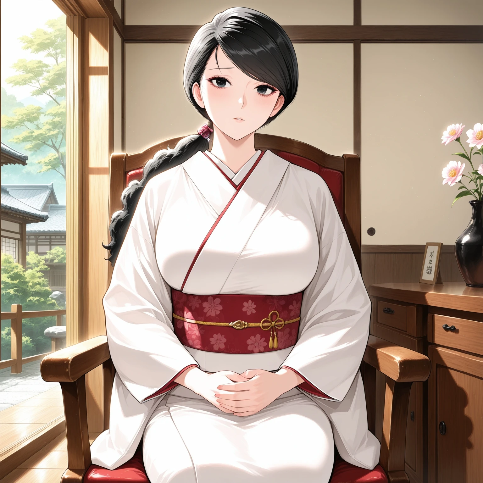 oito_hui_guo_rou,mature female,long hair,black hair,fluffy hair,low ponytail,swept bangs,black eyes,eyelash,lower eyelash, japanese clothes