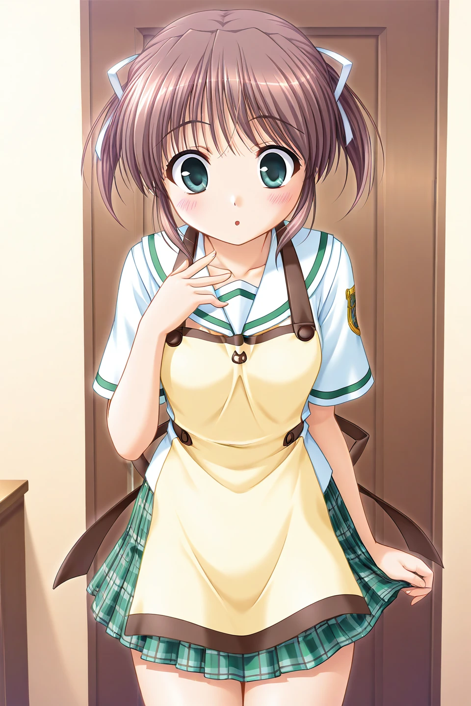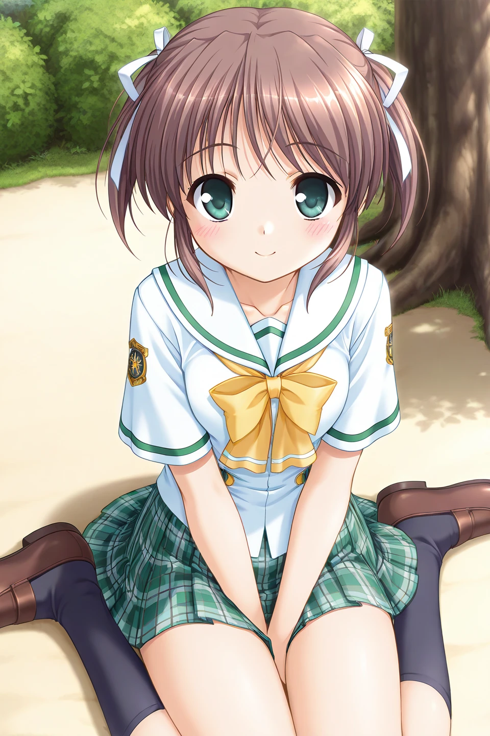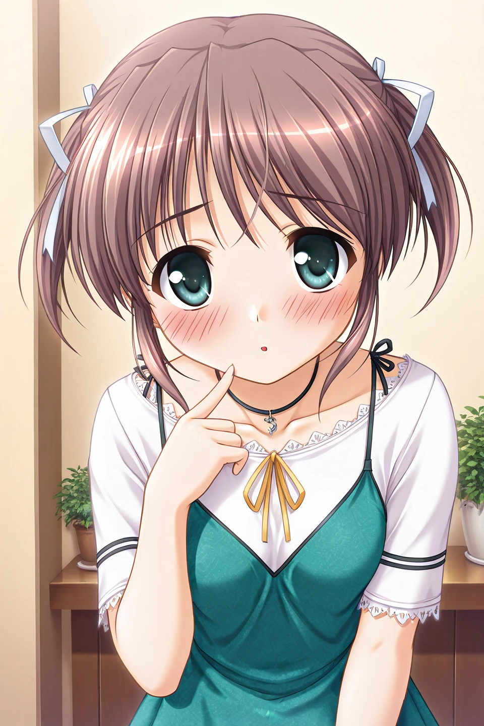 asagiri mai, 1girl, solo, green eyes, brown hair, short hair, twintails, short twintails, bangs, sidelocks, ribbon, hair ribbon, white ribbon, small breasts