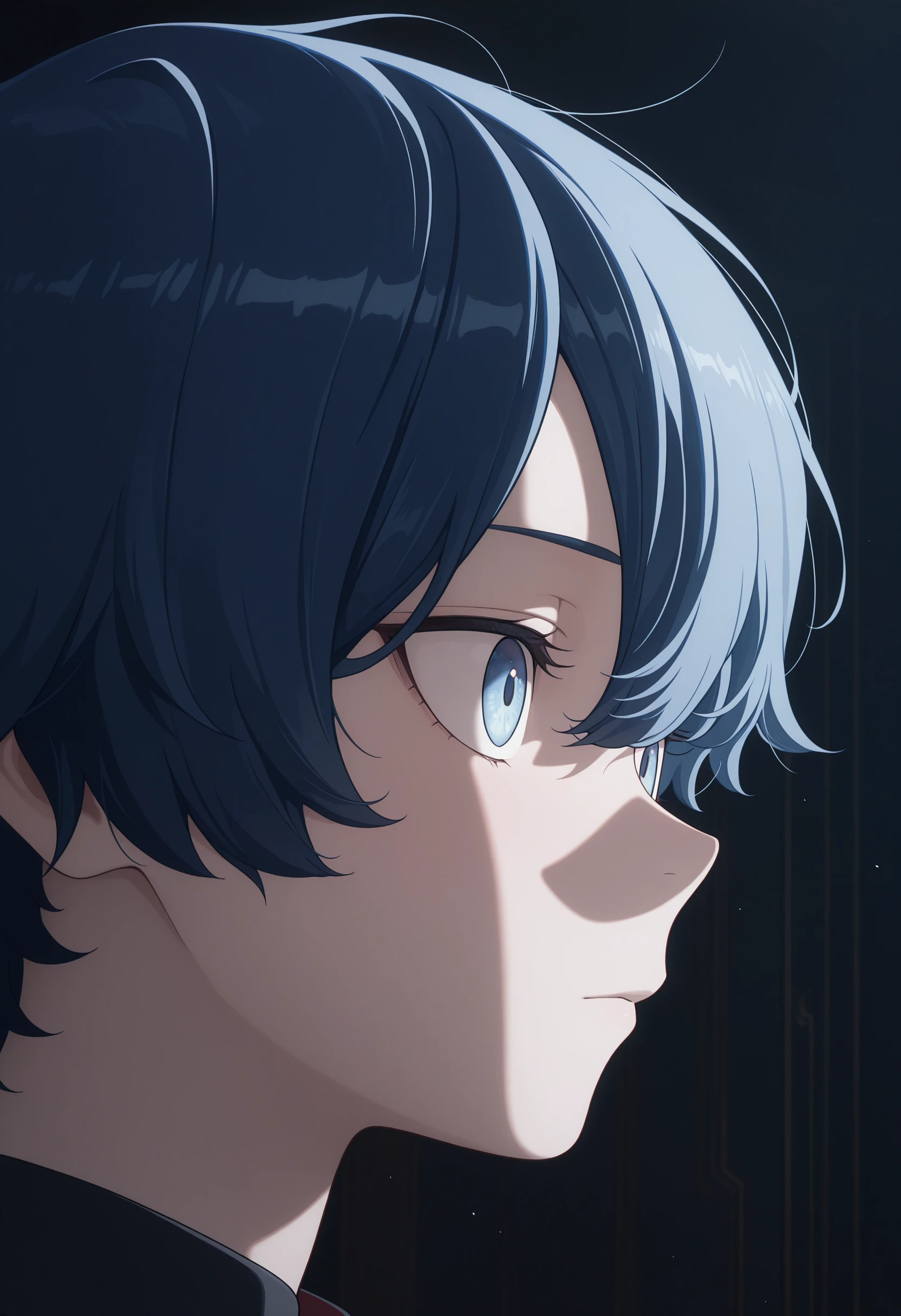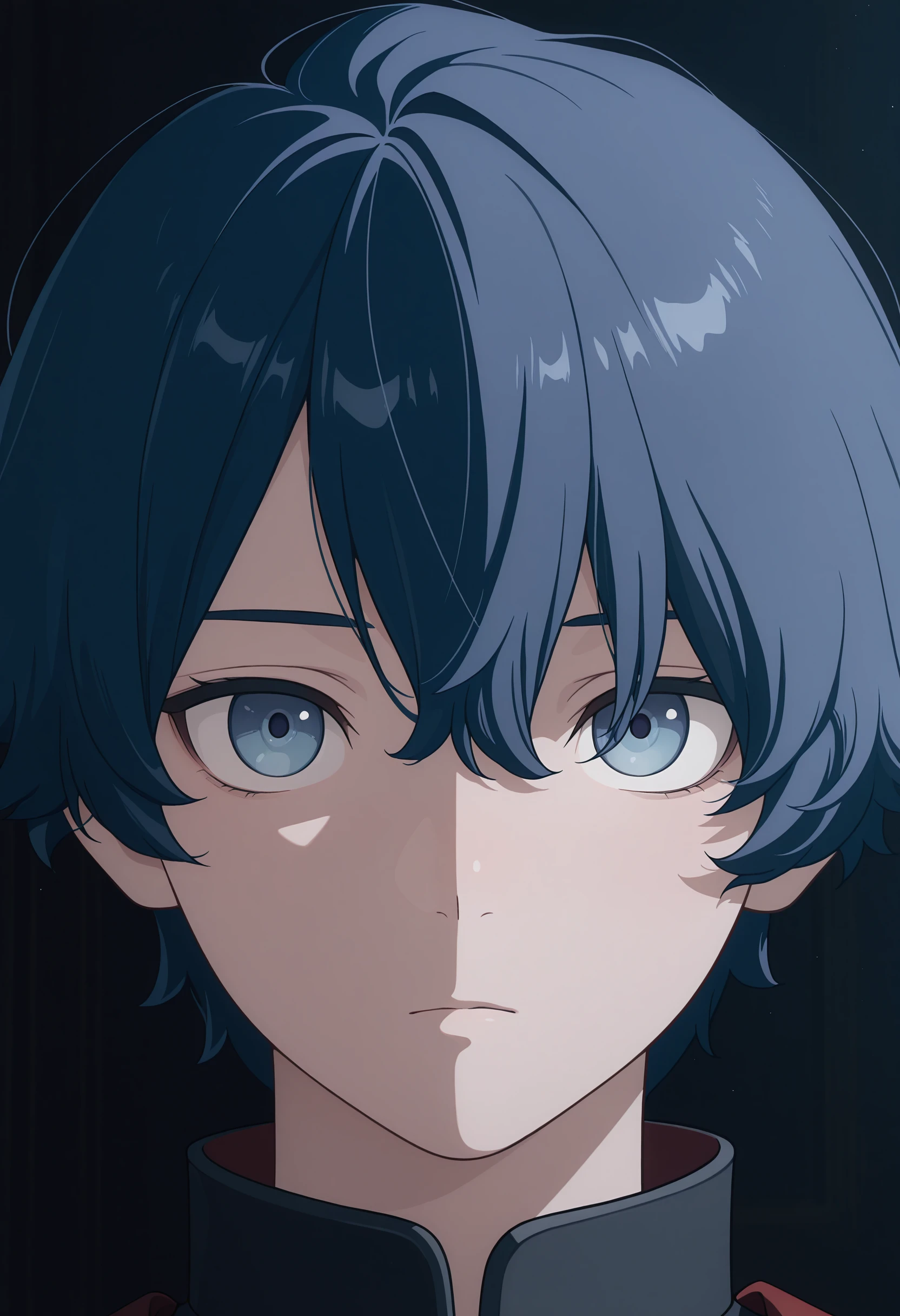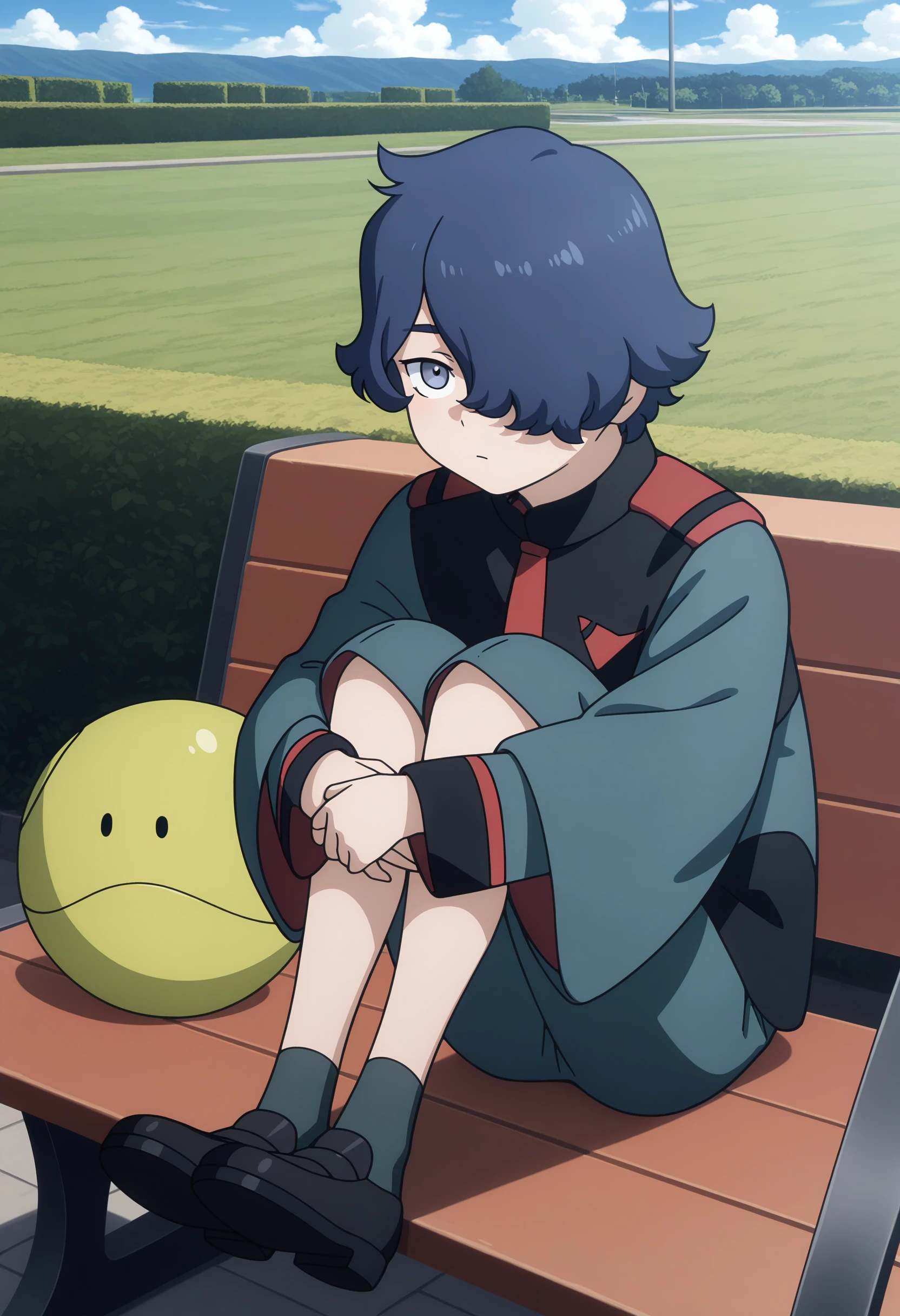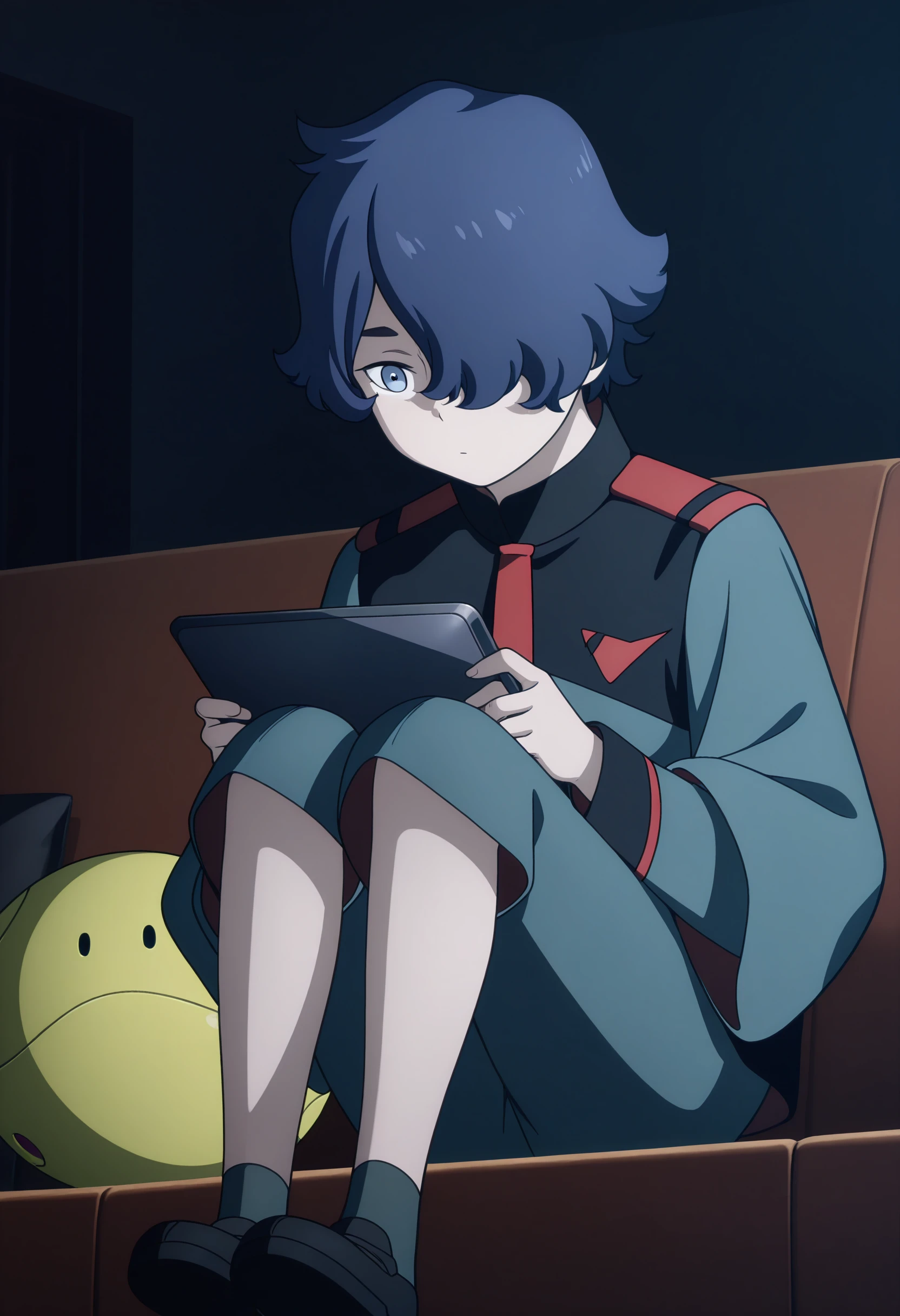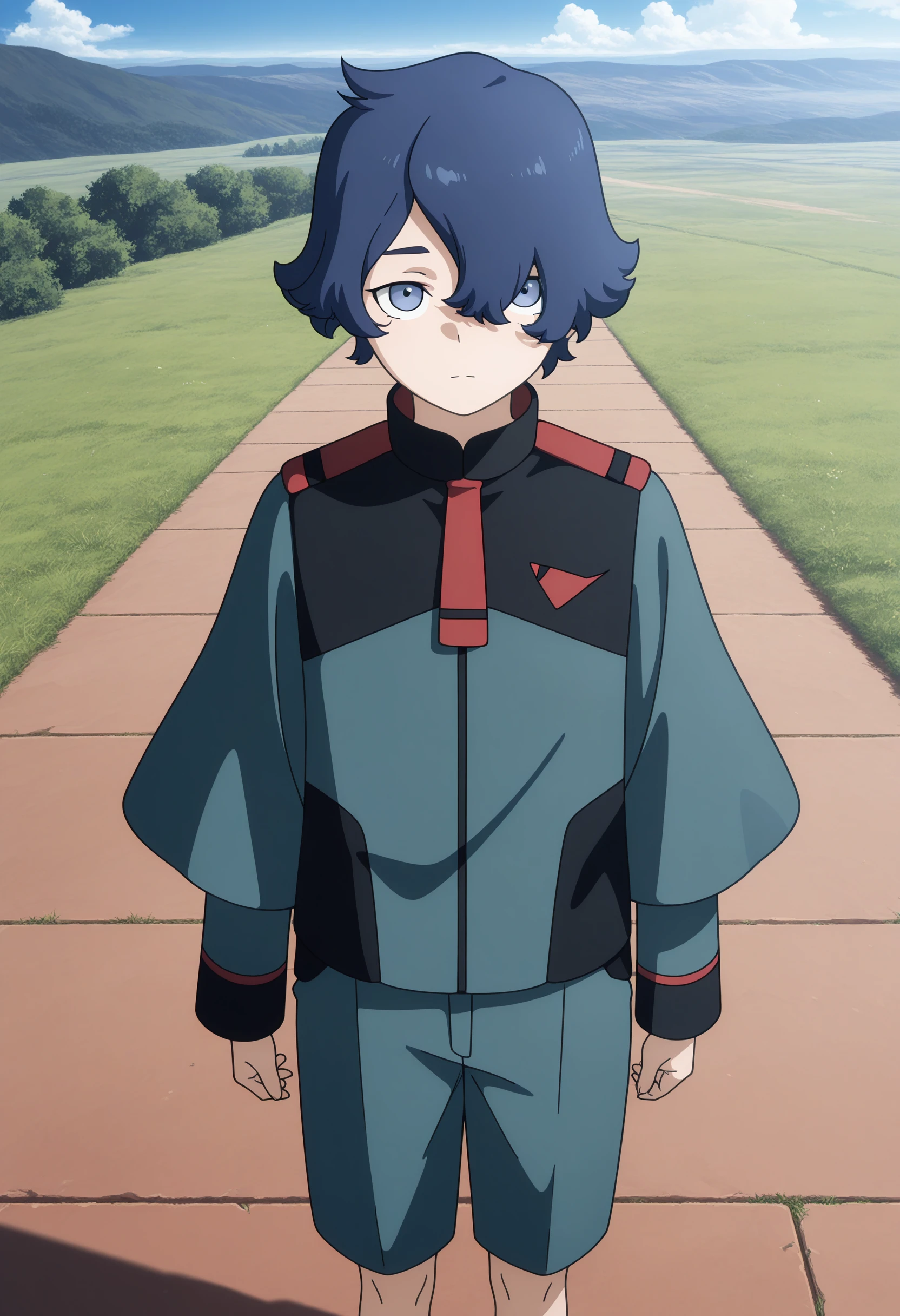 1boy, solo, rouj1, blue hair, short hair, blue eyes, hair over one eye, asticassia school uniform, green shorts, haro, holding haro