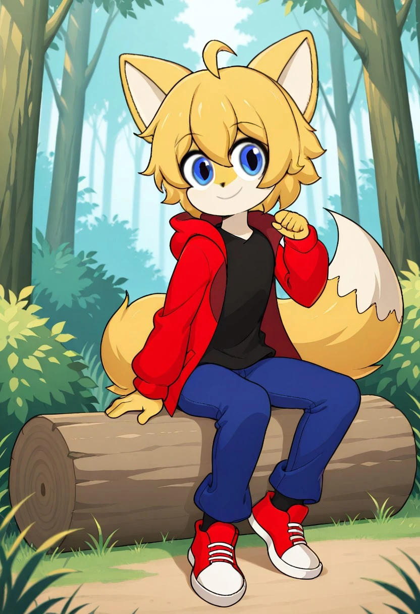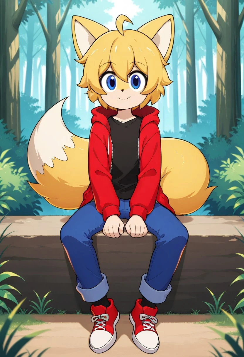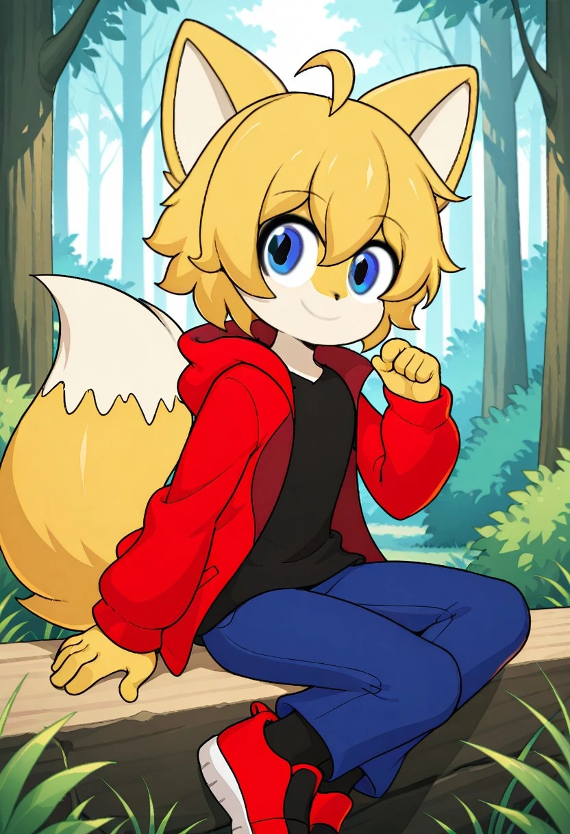 1boy, Foxxy, Blonde hair, short hair, blue eyes, fluffy hair, fox ears, fox tail, black fox nose,