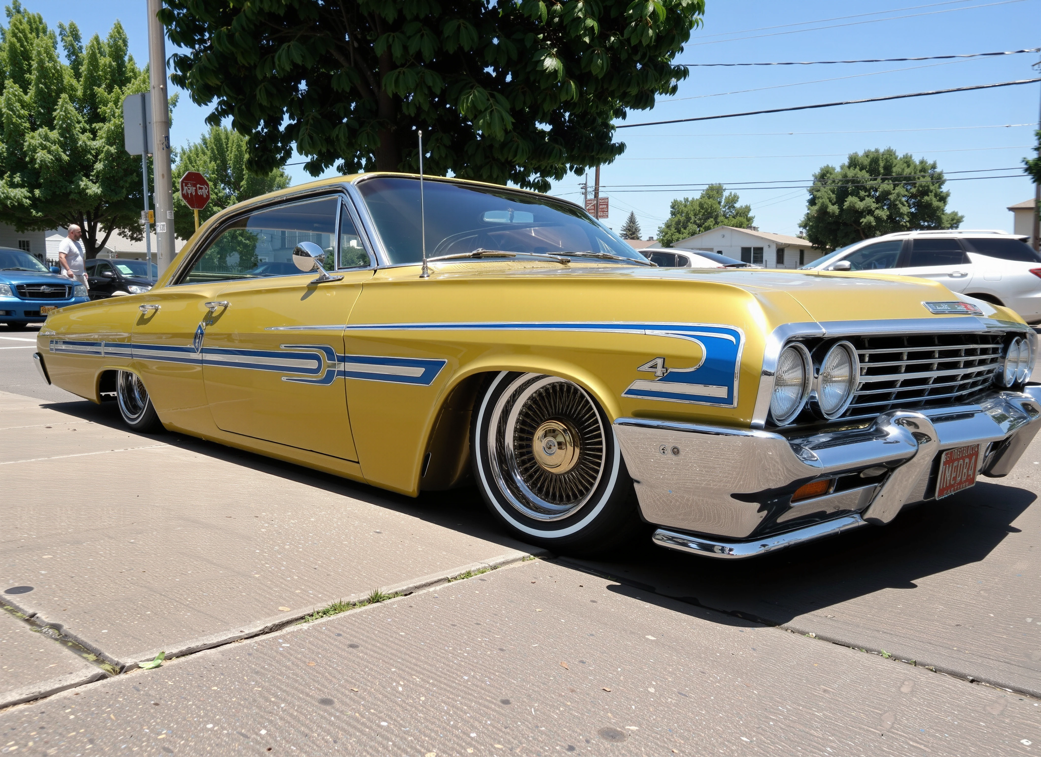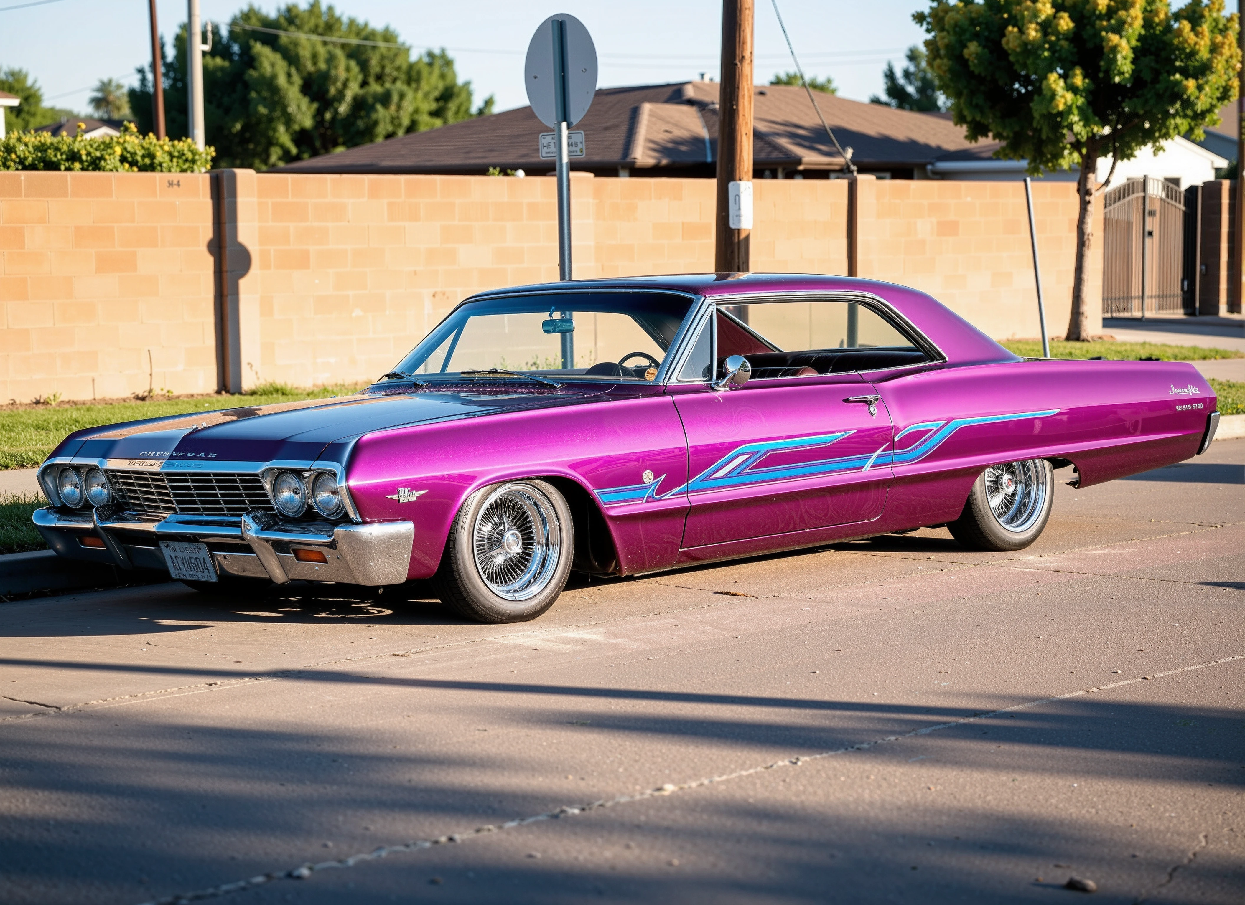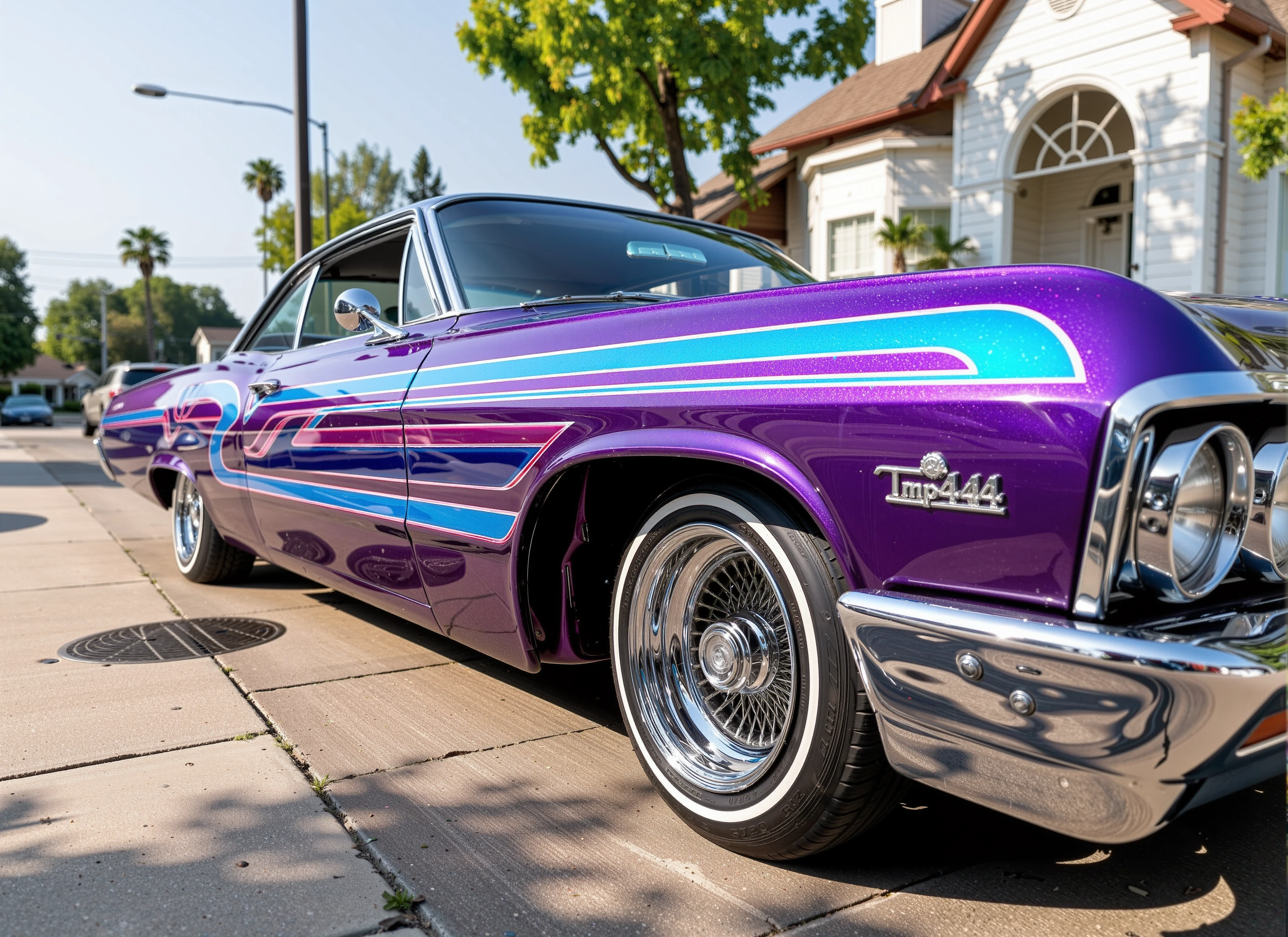 Main keyword "lowrider" is enough but you can add descriptions like "chrome wire wheels" or "chrome wire wheels", "white sidewall tires" and "metalflake paint" "metalflake paint with designs/airbrushing on it"