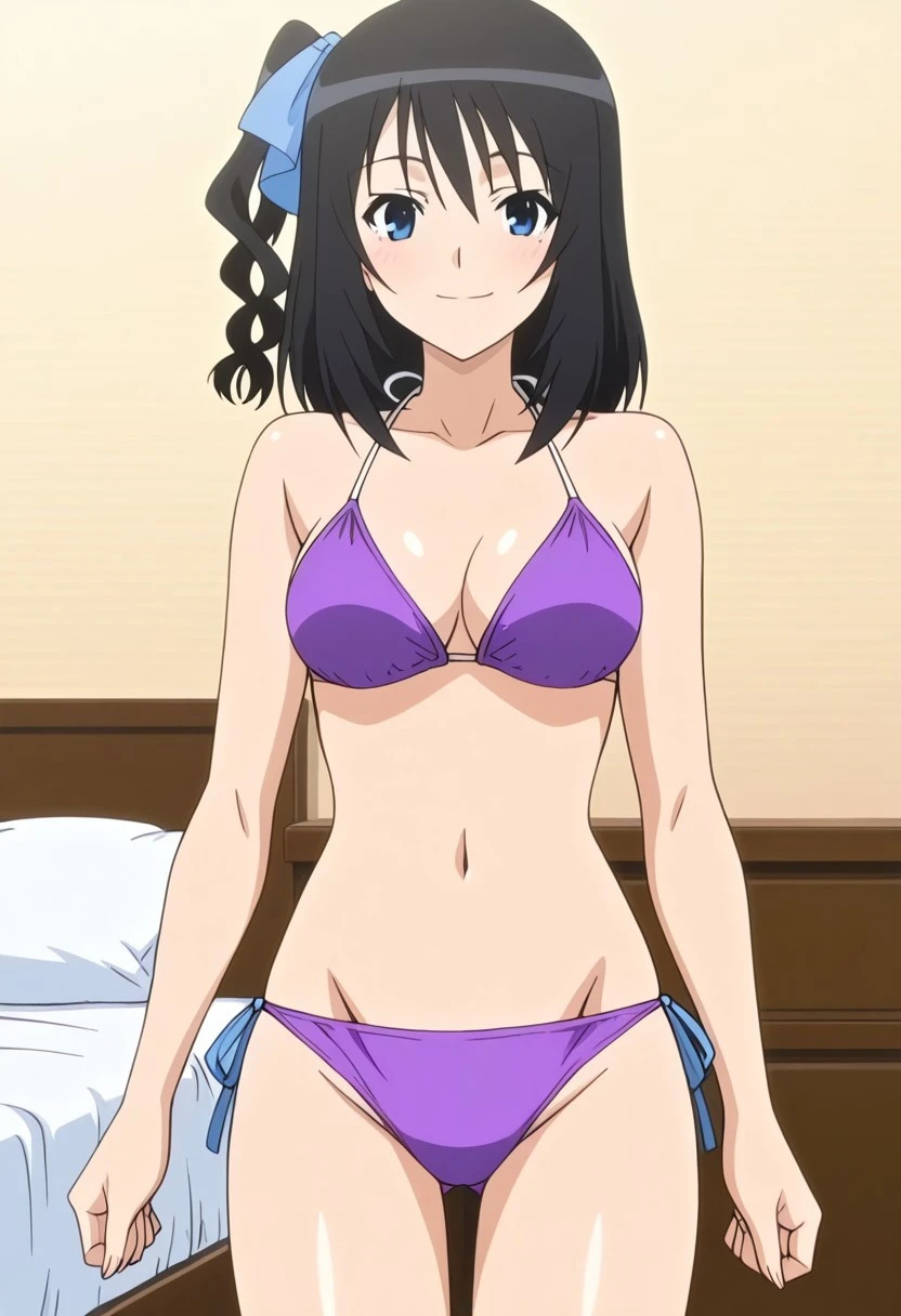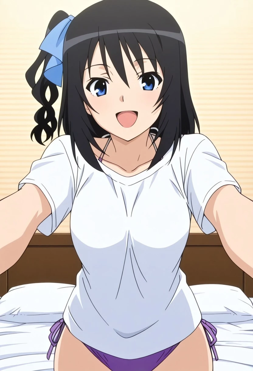 sawa kiryuu joshikousei no koshitsuki anime style, black hair, medium hair, one side up, hair ribbon, blue ribbon, blue eyes, medium breasts,