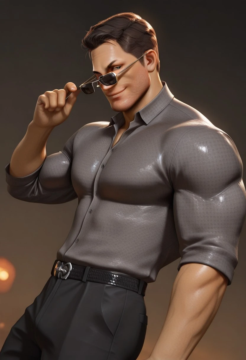 J0hnny, 1boy, bottomn, brown hair, handsome, stubble, black eyes, black pants, belt with silver bucle