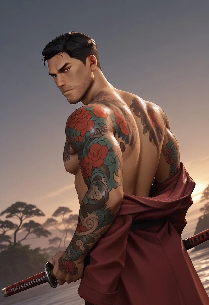 K3nshixJ0hnnyMK1, couple, 2boys, gay, yaoi, male with male, semi-realistic, multiple boys, different boys, johnny bottomn, kenshi top, kenshi tattoos, male focus, black hair, johnny brown hair,