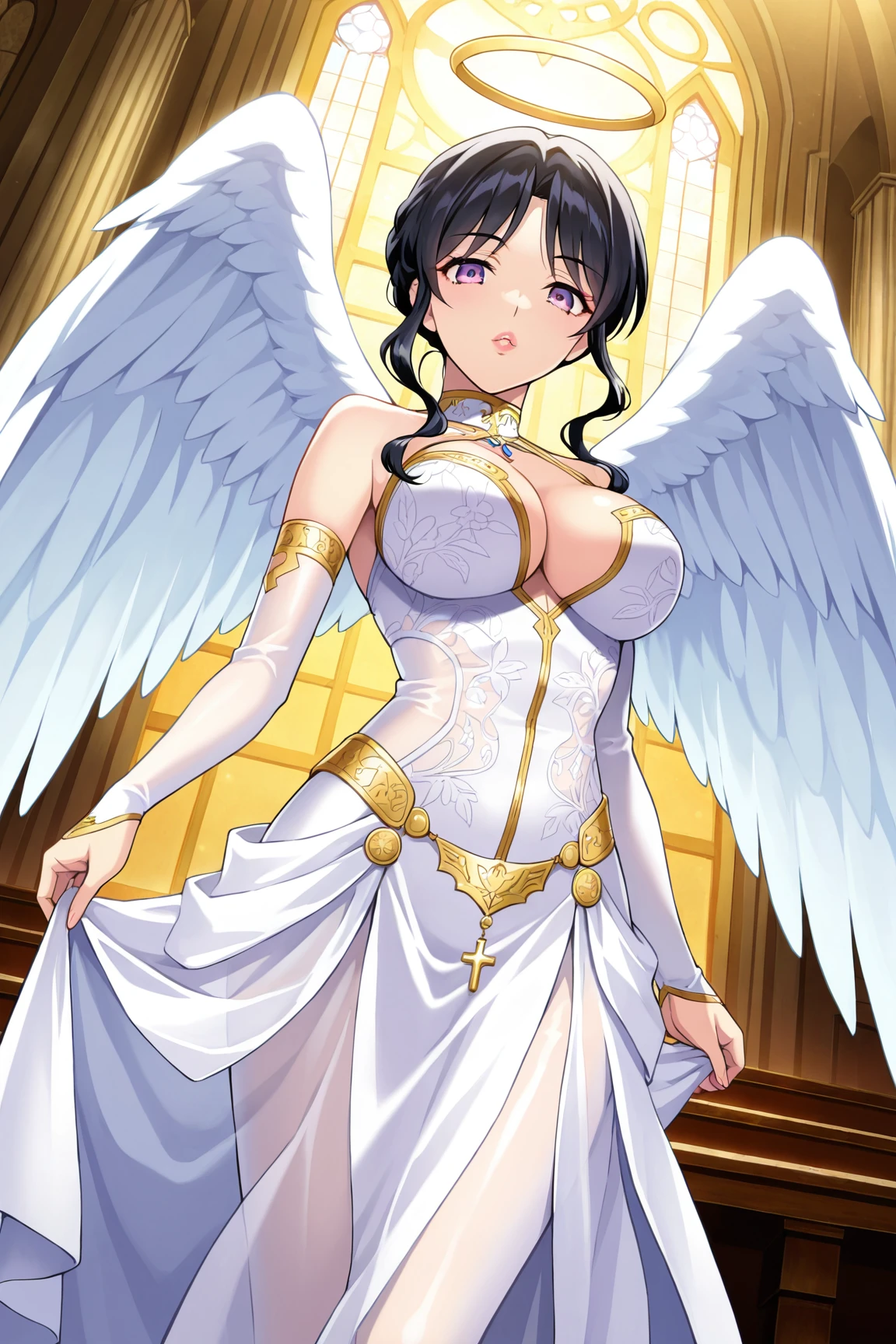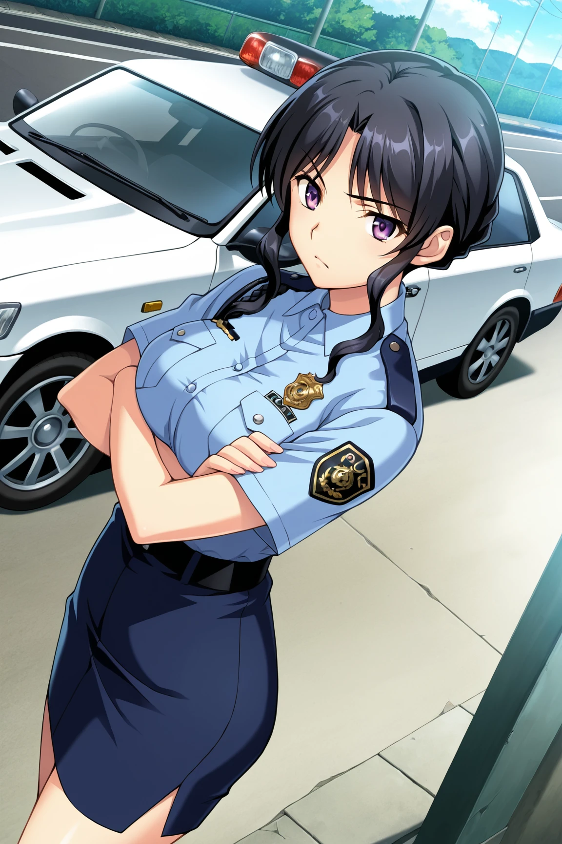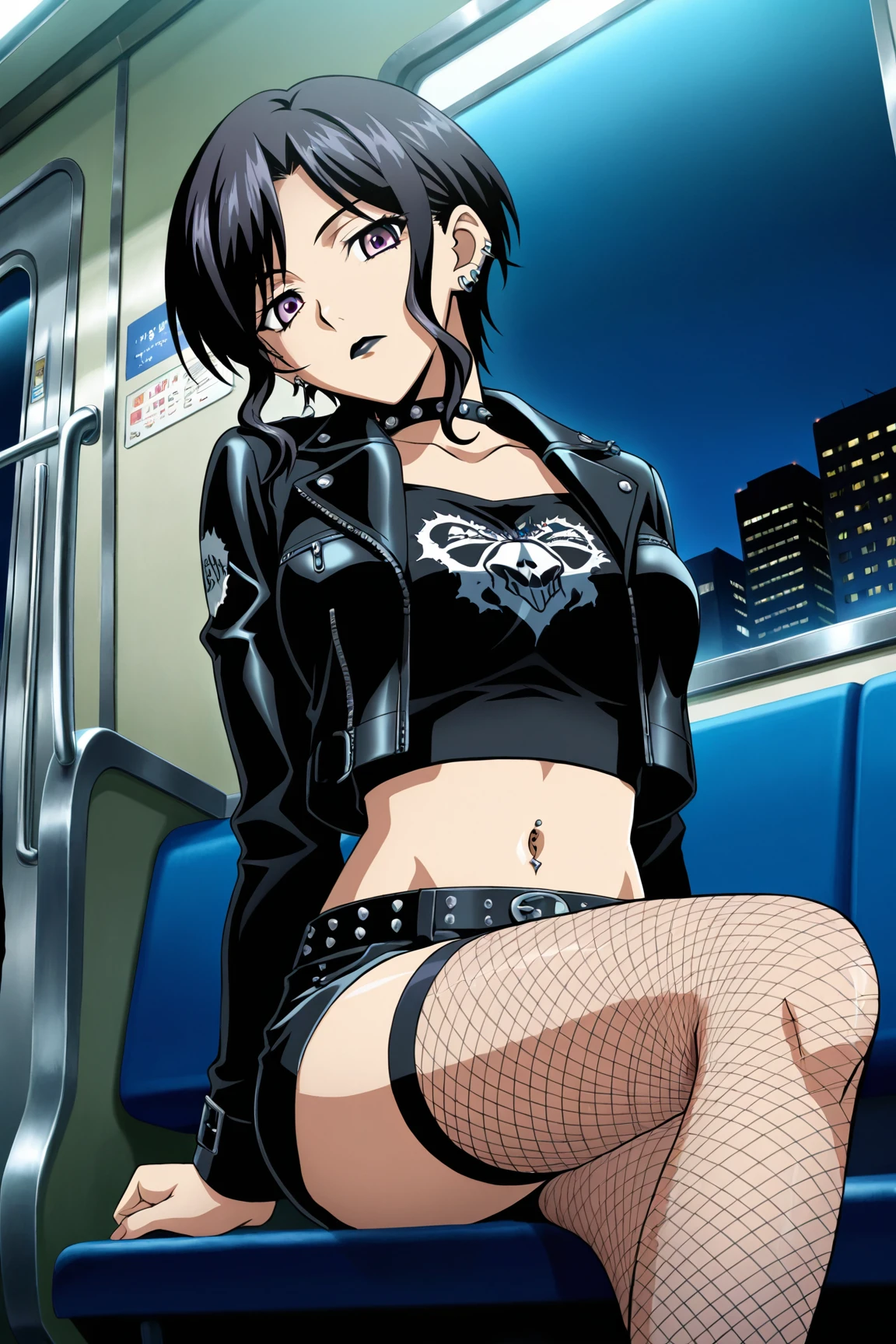 Appearence : black hair,short hair,parted bangs,sidelocks,purple eyes