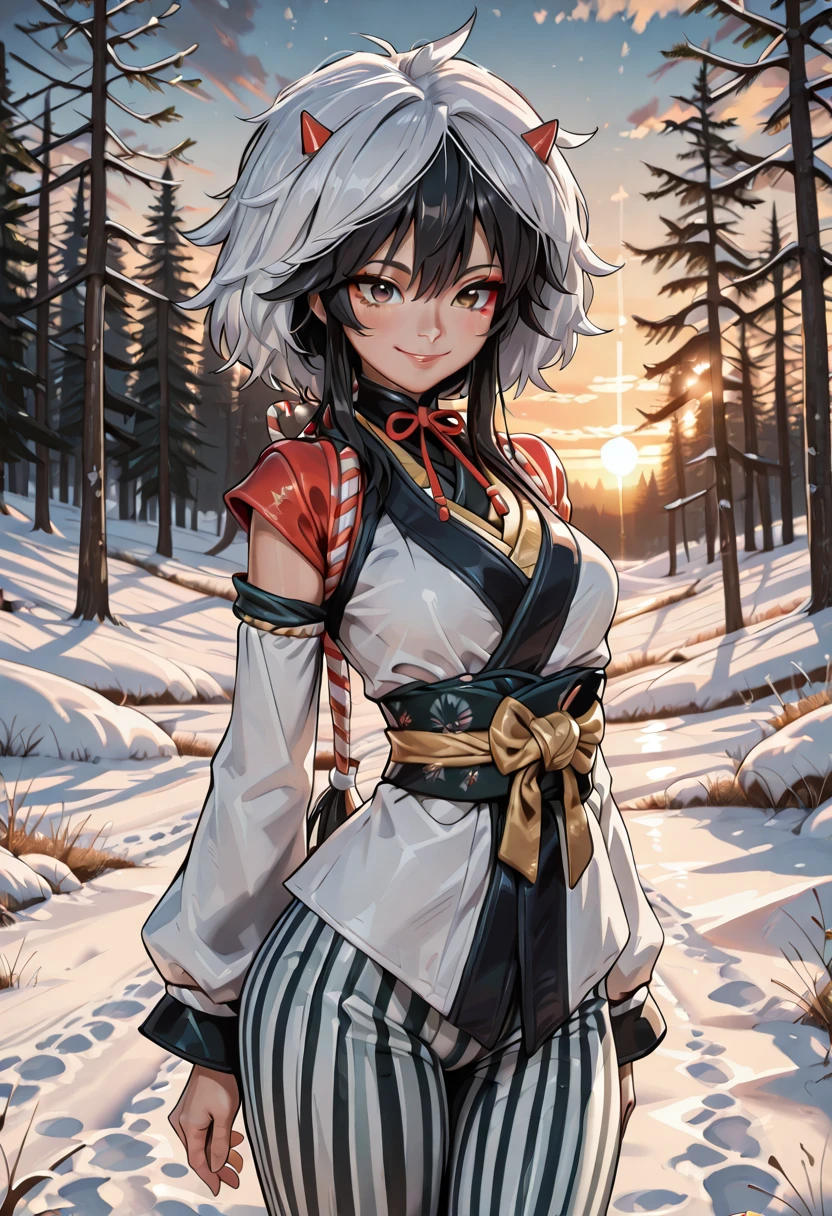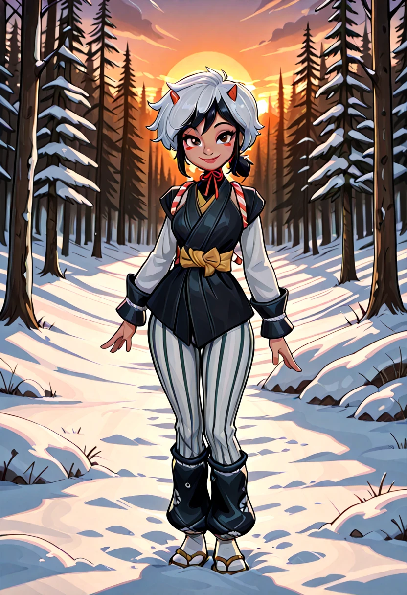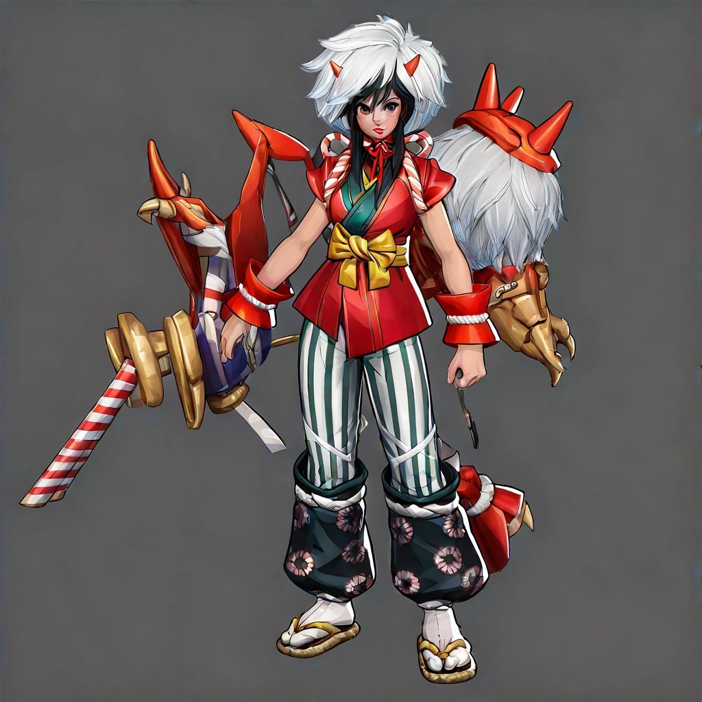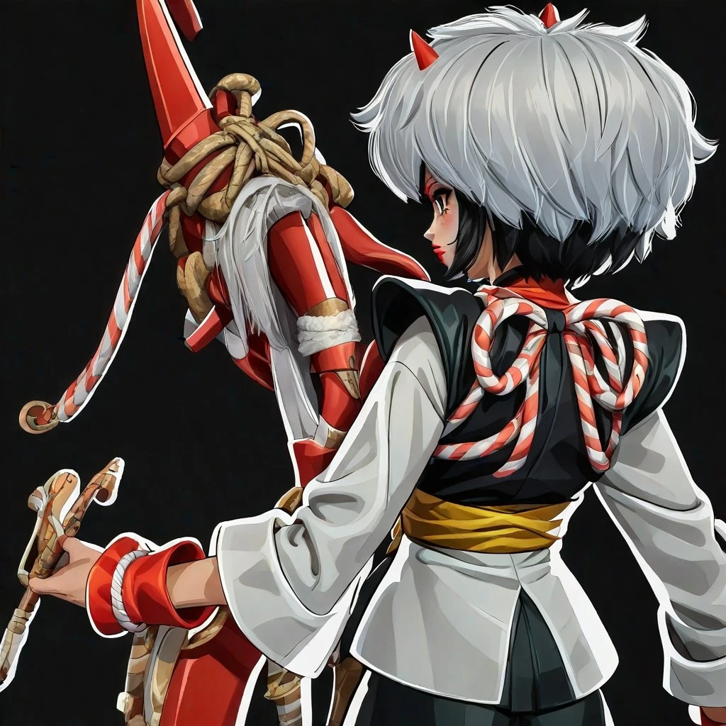 peniparkerysmr, brown eyes, black hair, white wig, horns, yatsukahagi outfit, makeup,