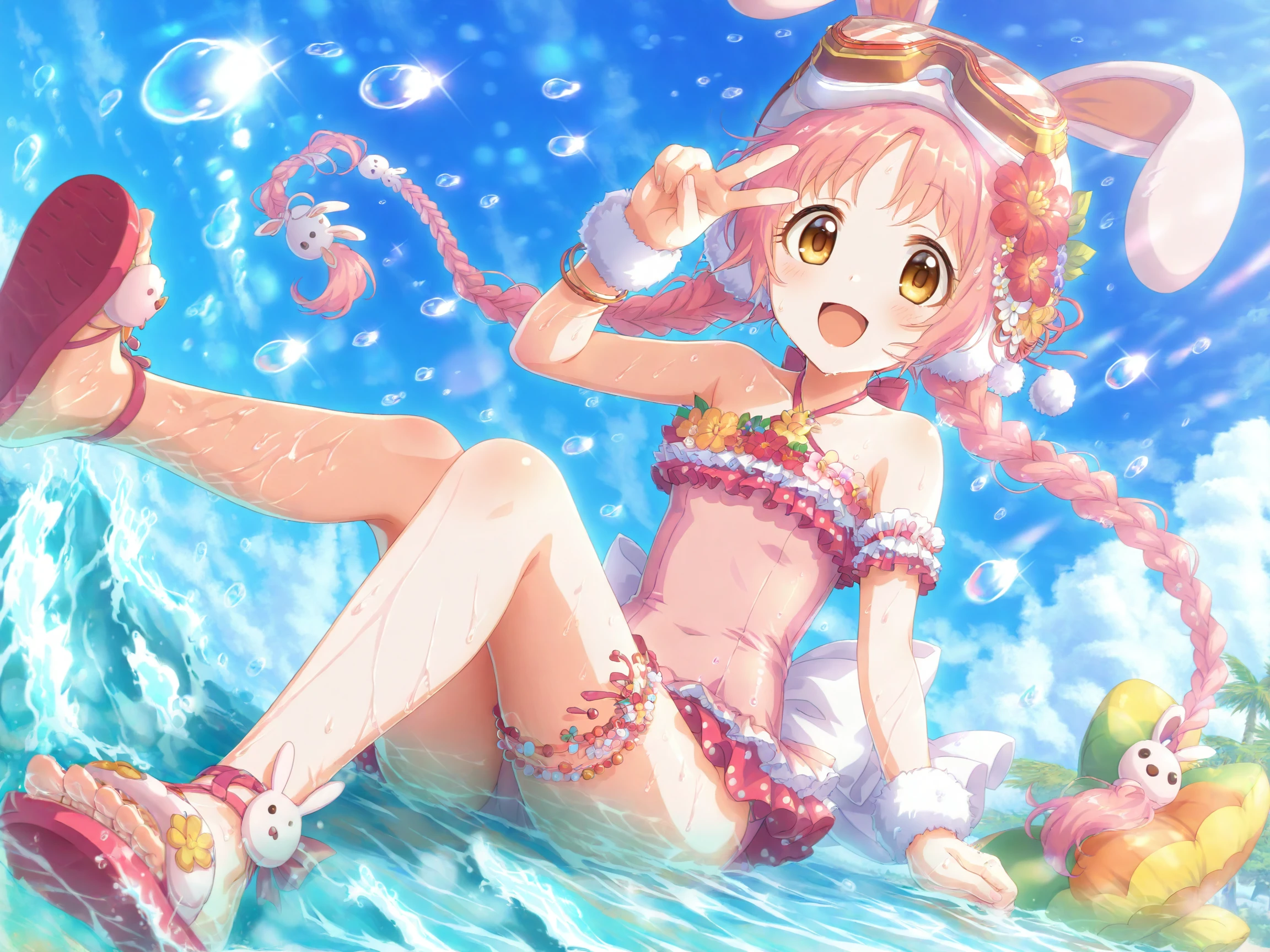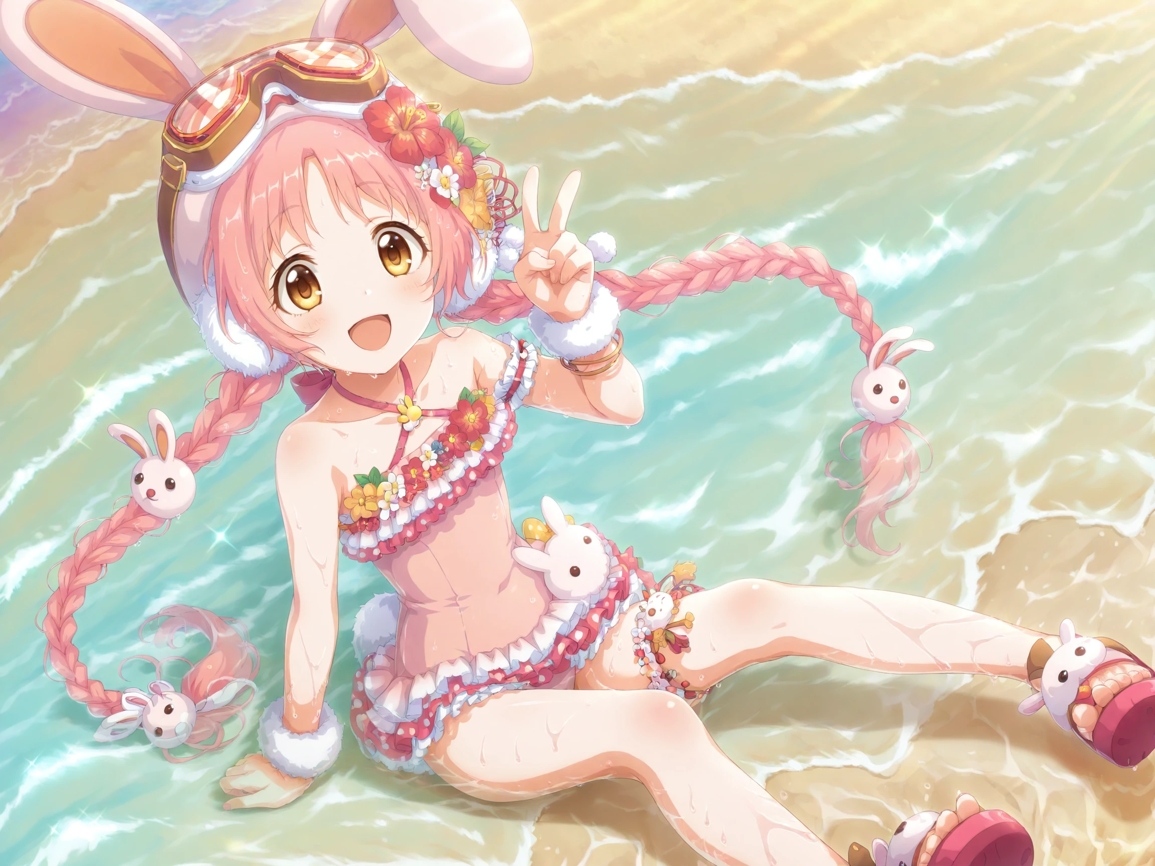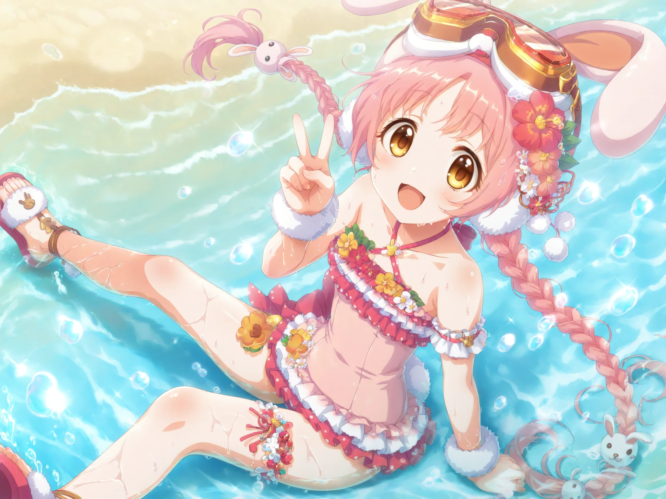 absurdres,official style,more details,<lora:Mimi54??:1>,1girl,rabbit hat,solo,rabbit hair ornament,swimsuit,hair flower,rabbit ears,pink hair,sandals,flower,braid,animal hat,twin braids,one-piece swimsuit,pink one-piece swimsuit,twintails,casual one-piece swimsuit,frilled one-piece swimsuit,goggles on headwear,brown eyes,very long hair,arm garter,halterneck,bridal garter,yellow eyes,thigh strap,beach,wet body,sitting in the sea,v,