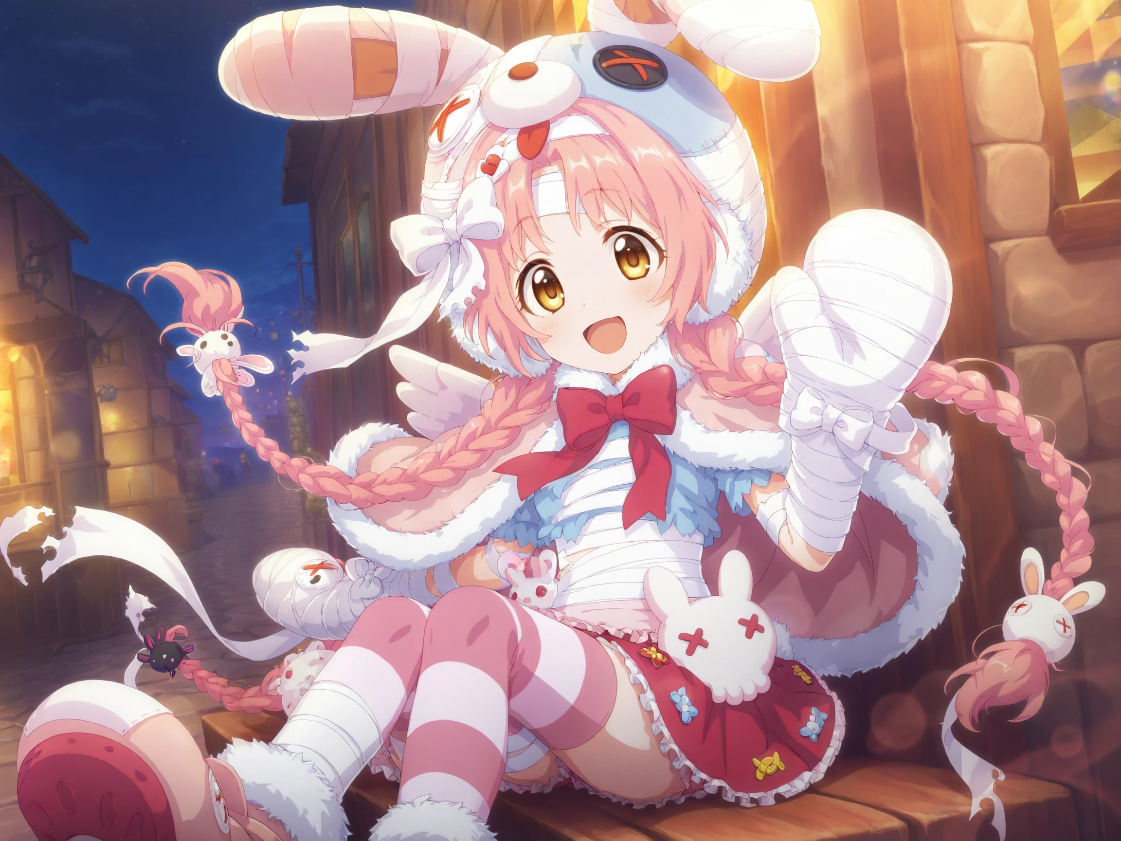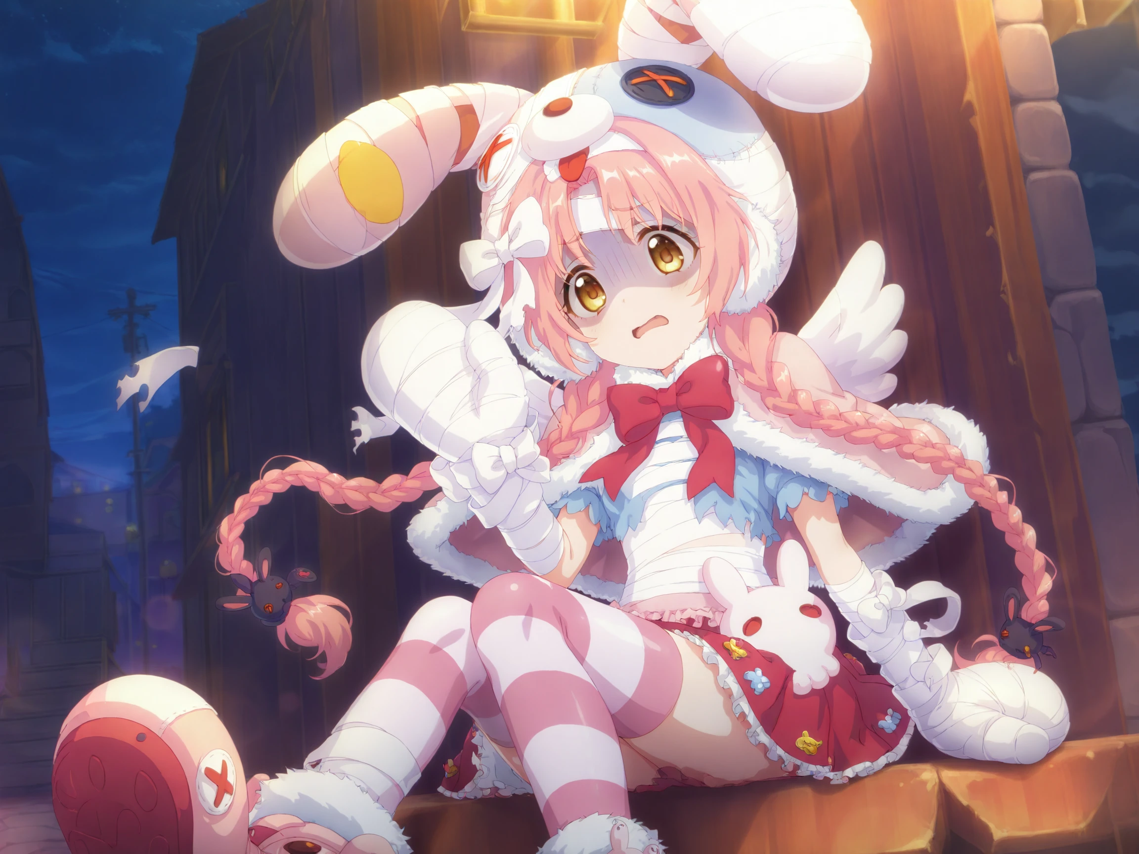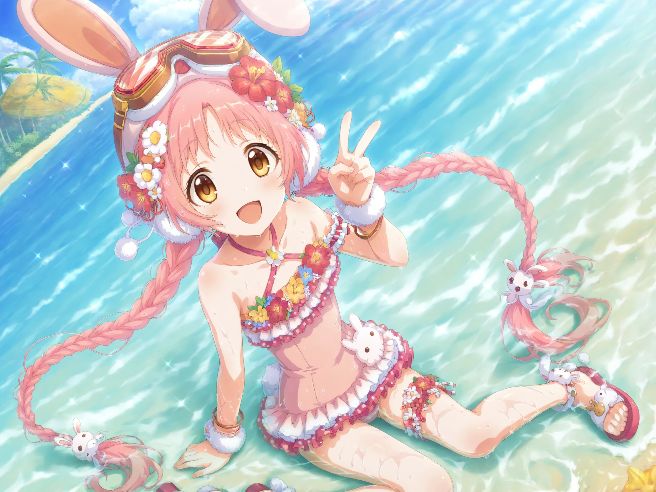 absurdres,official style,more details,<lora:Mimi54??:1>,1girl,rabbit hat,solo,rabbit hair ornament,swimsuit,hair flower,rabbit ears,pink hair,sandals,flower,braid,animal hat,twin braids,one-piece swimsuit,pink one-piece swimsuit,twintails,casual one-piece swimsuit,frilled one-piece swimsuit,goggles on headwear,brown eyes,very long hair,arm garter,halterneck,bridal garter,yellow eyes,thigh strap,beach,wet body,sitting in the sea,v,